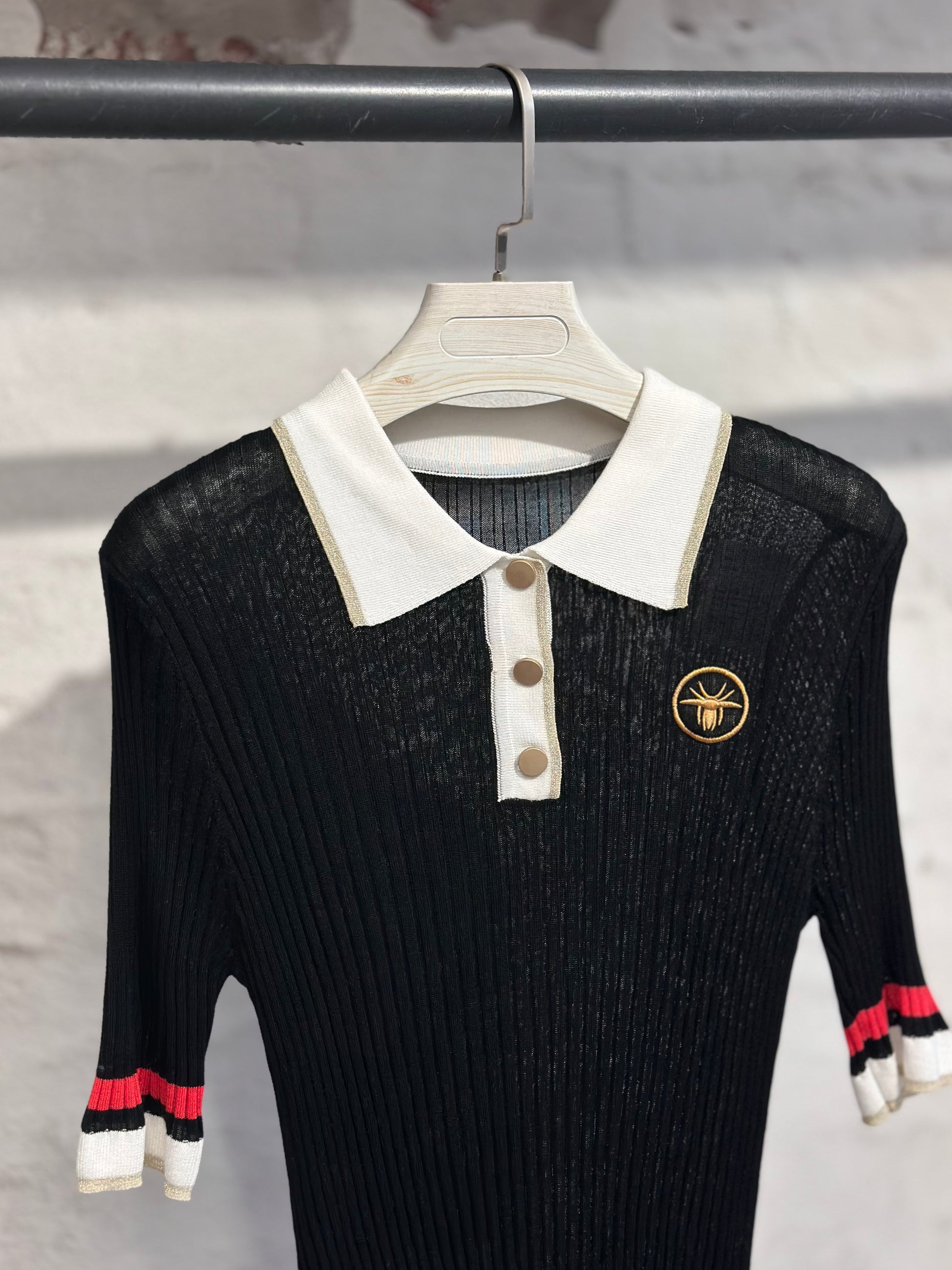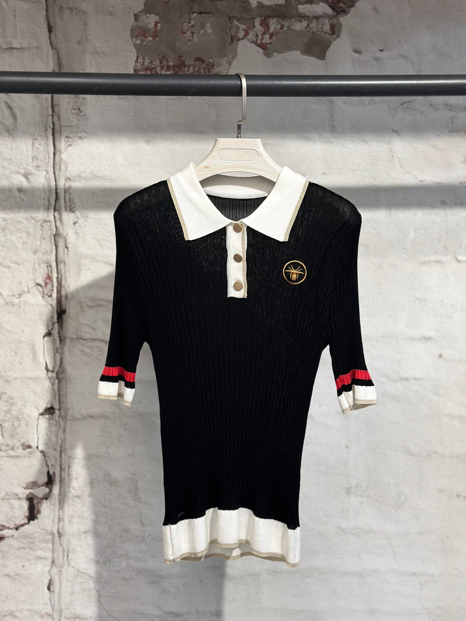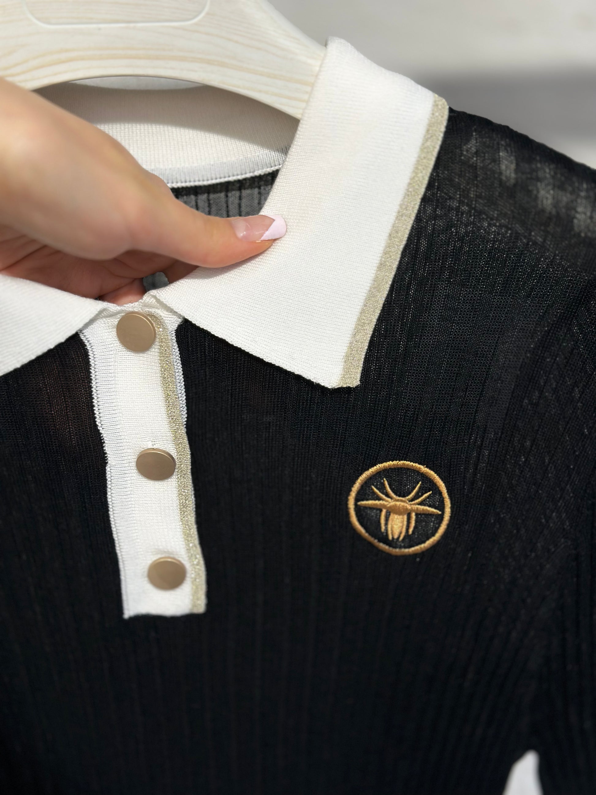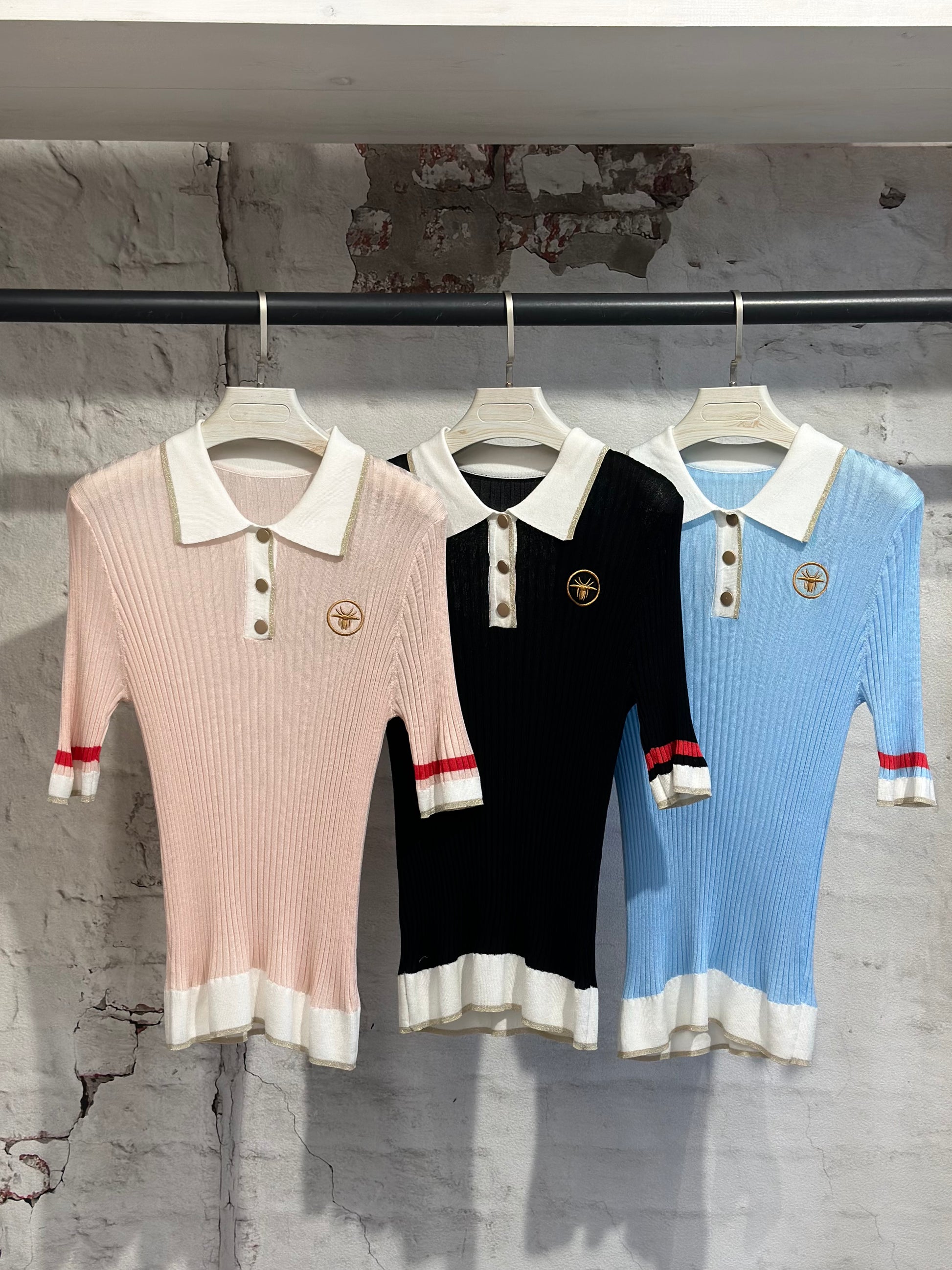 Елегантен модел от фино рипсено плетиво с контрастна бяла яка и копчета. Акцентни детайли по ръкавите и дискретна емблема отпред придават завършен и стилен вид. Предлага се в розово, черно и светлосиньо.