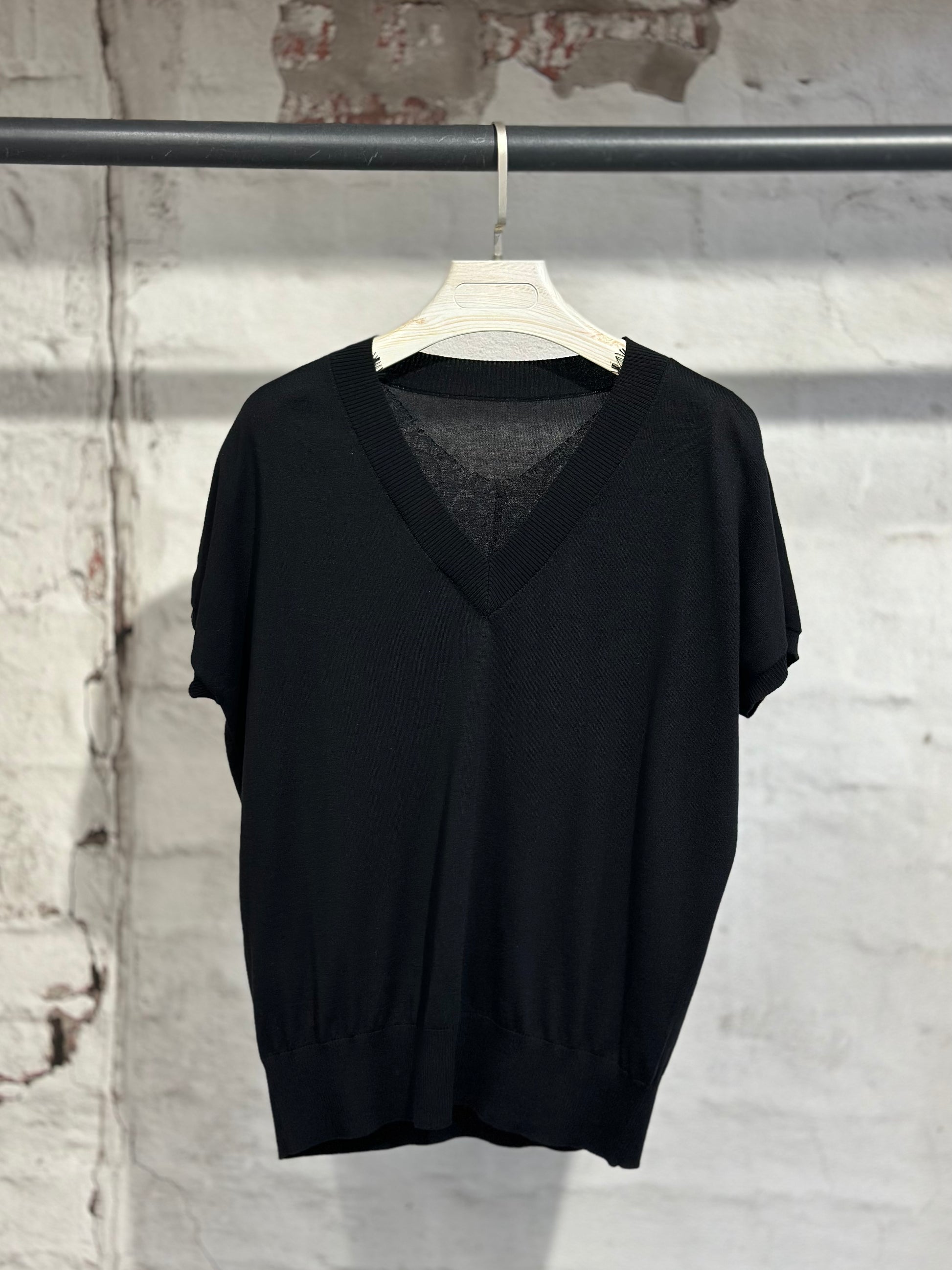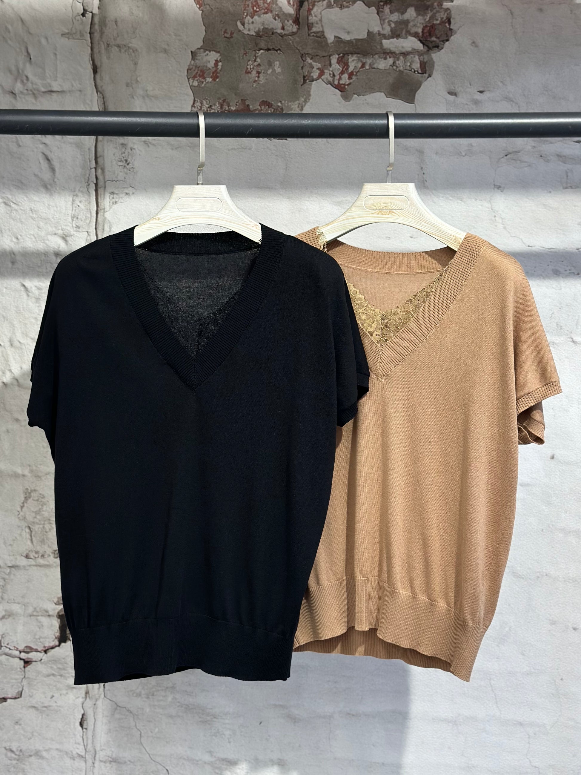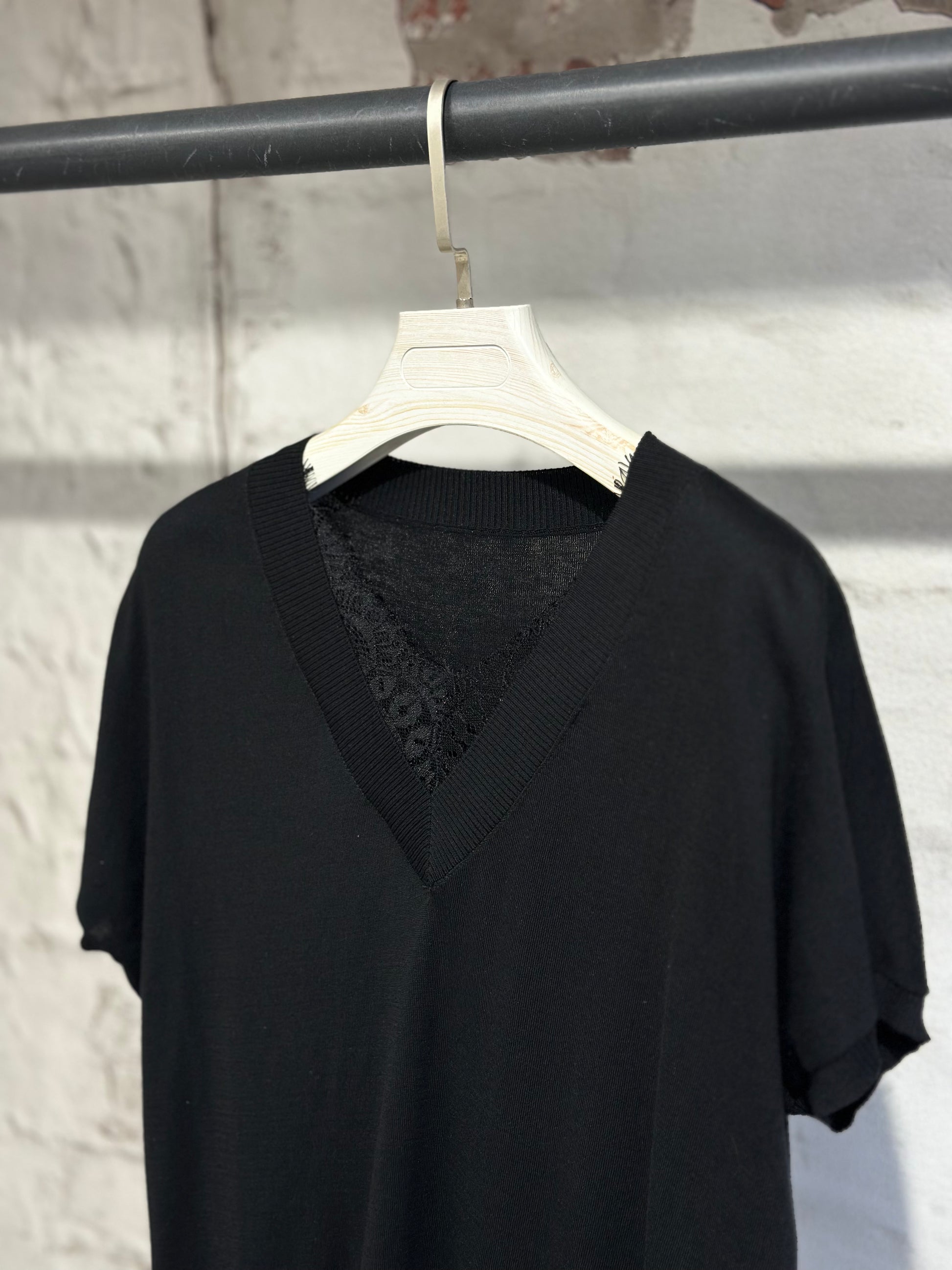 Фина дамска блуза от фино тънко плетиво и деликатна дантела – стилна, удобна и женствена. Лека, мека и приятна на допир – идеален избор както за ежедневието, така и за по-специални поводи.