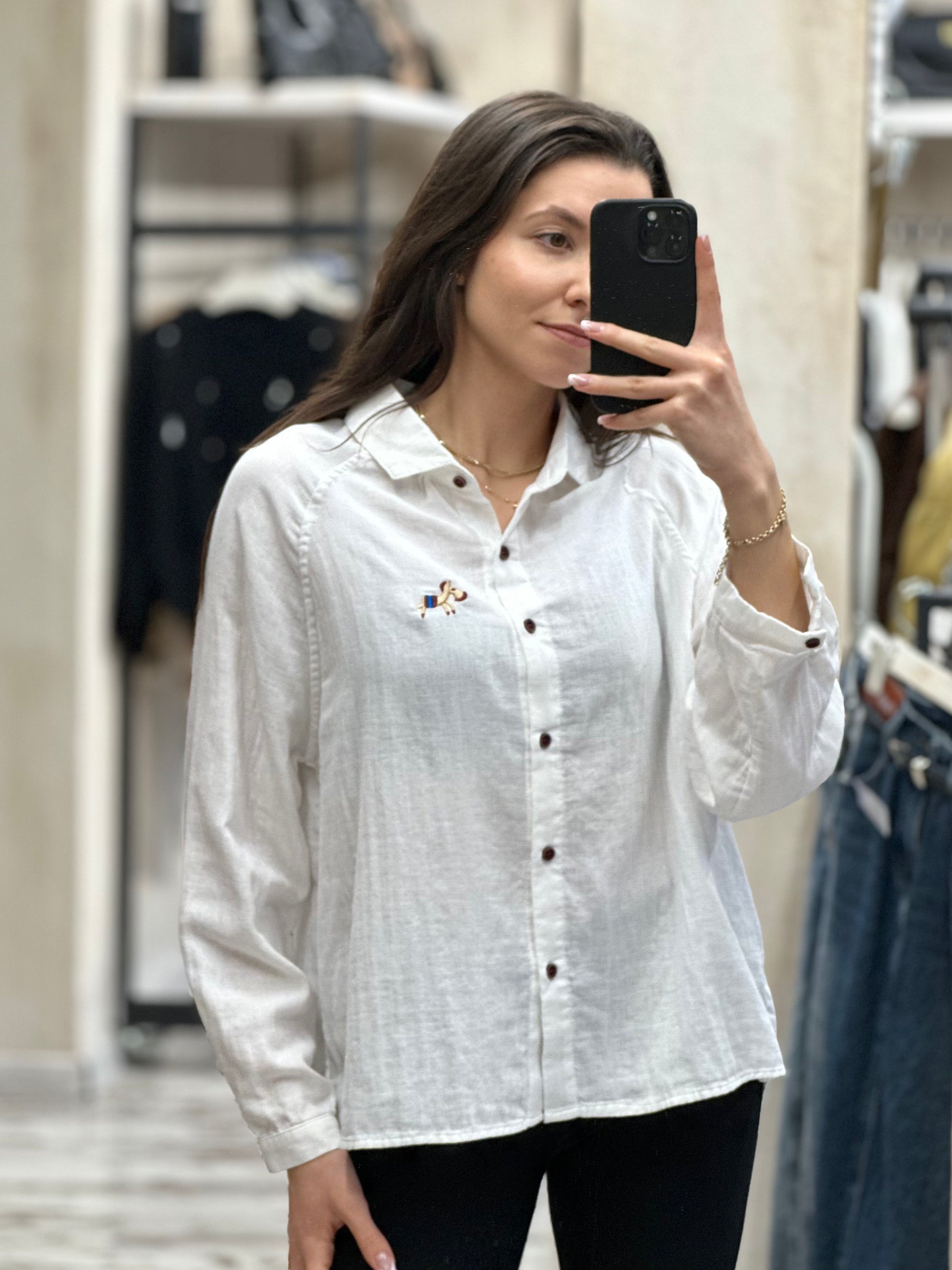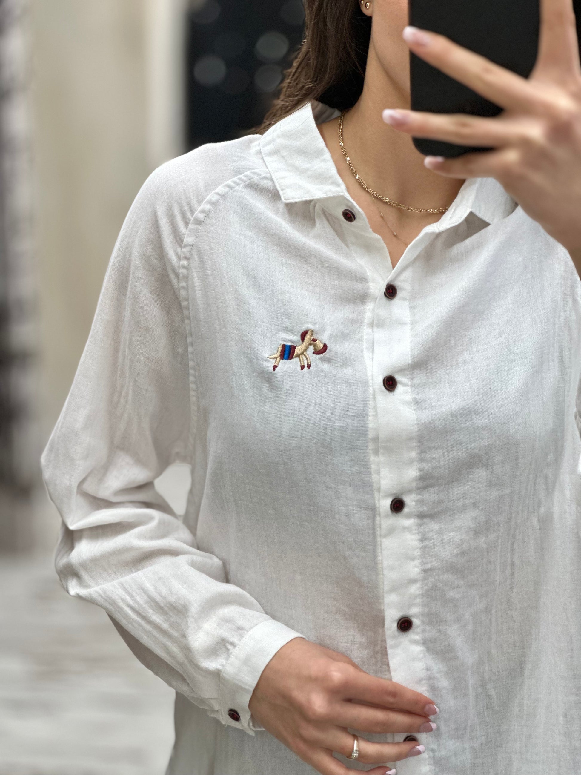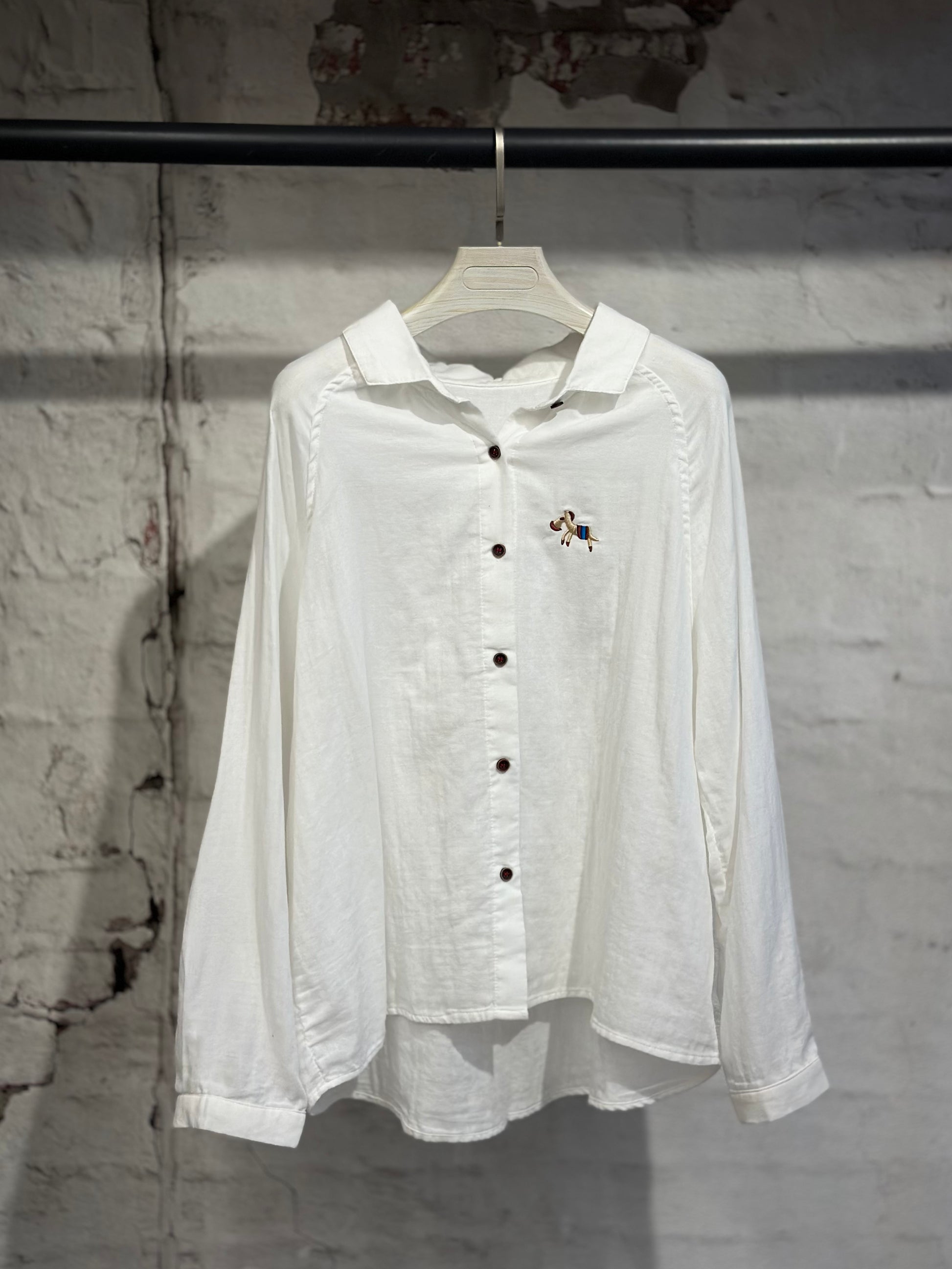 Стилна памучна риза с класическа яка и закопчаване с копчета, изработена от лека и приятна на допир материя. Деликатна бродерия с конче отпред придава свеж и отличителен акцент. Леко свободна кройка за комфорт и лесно комбиниране.