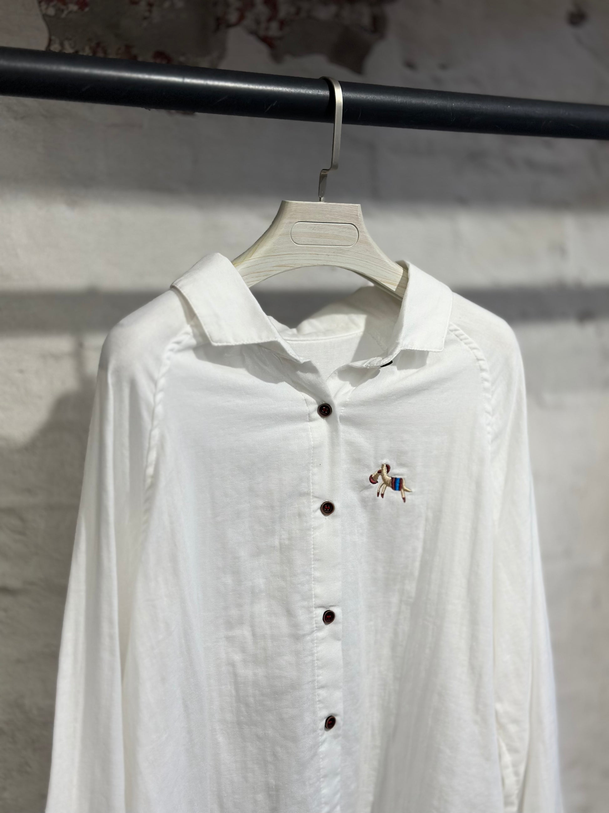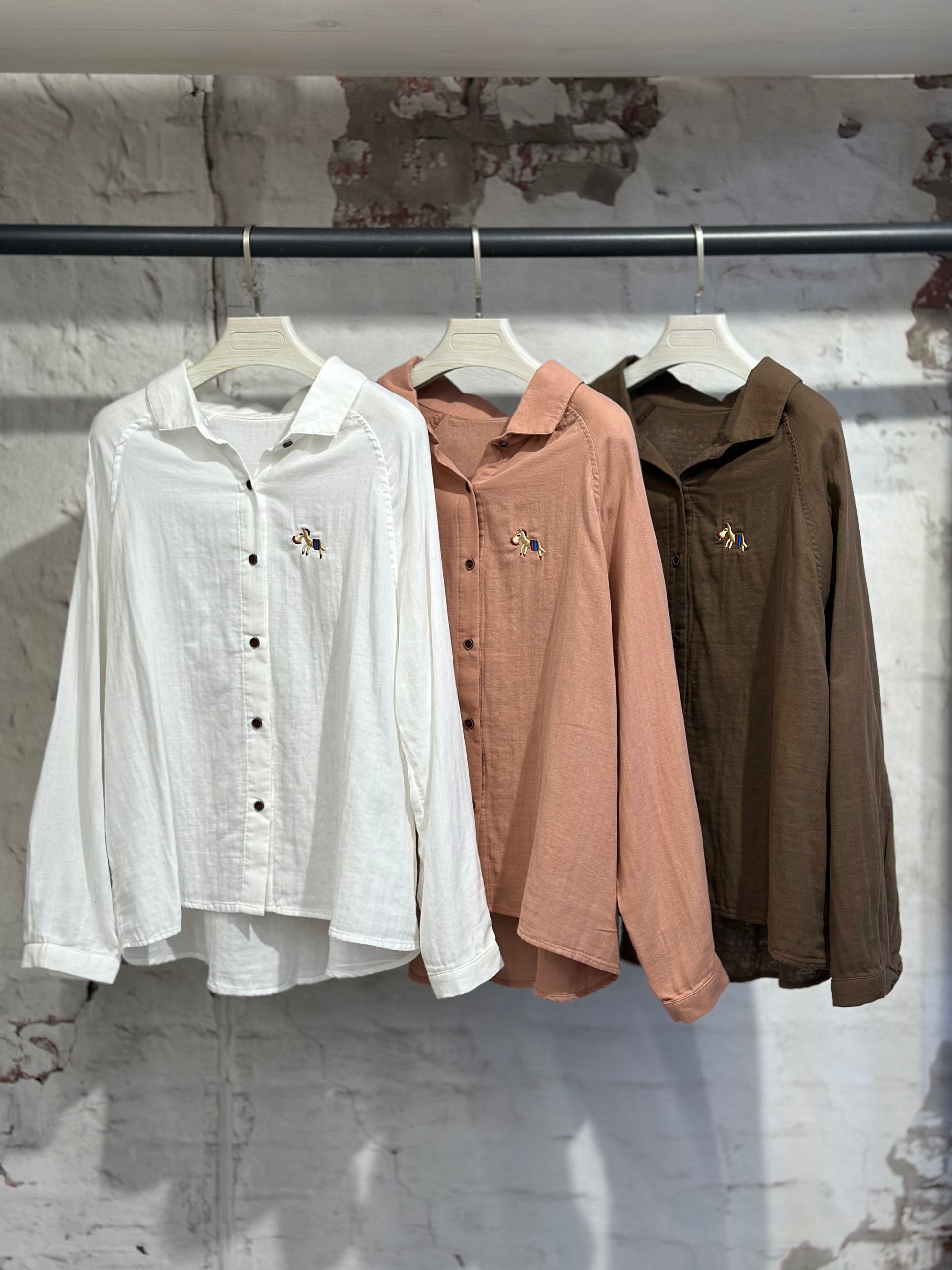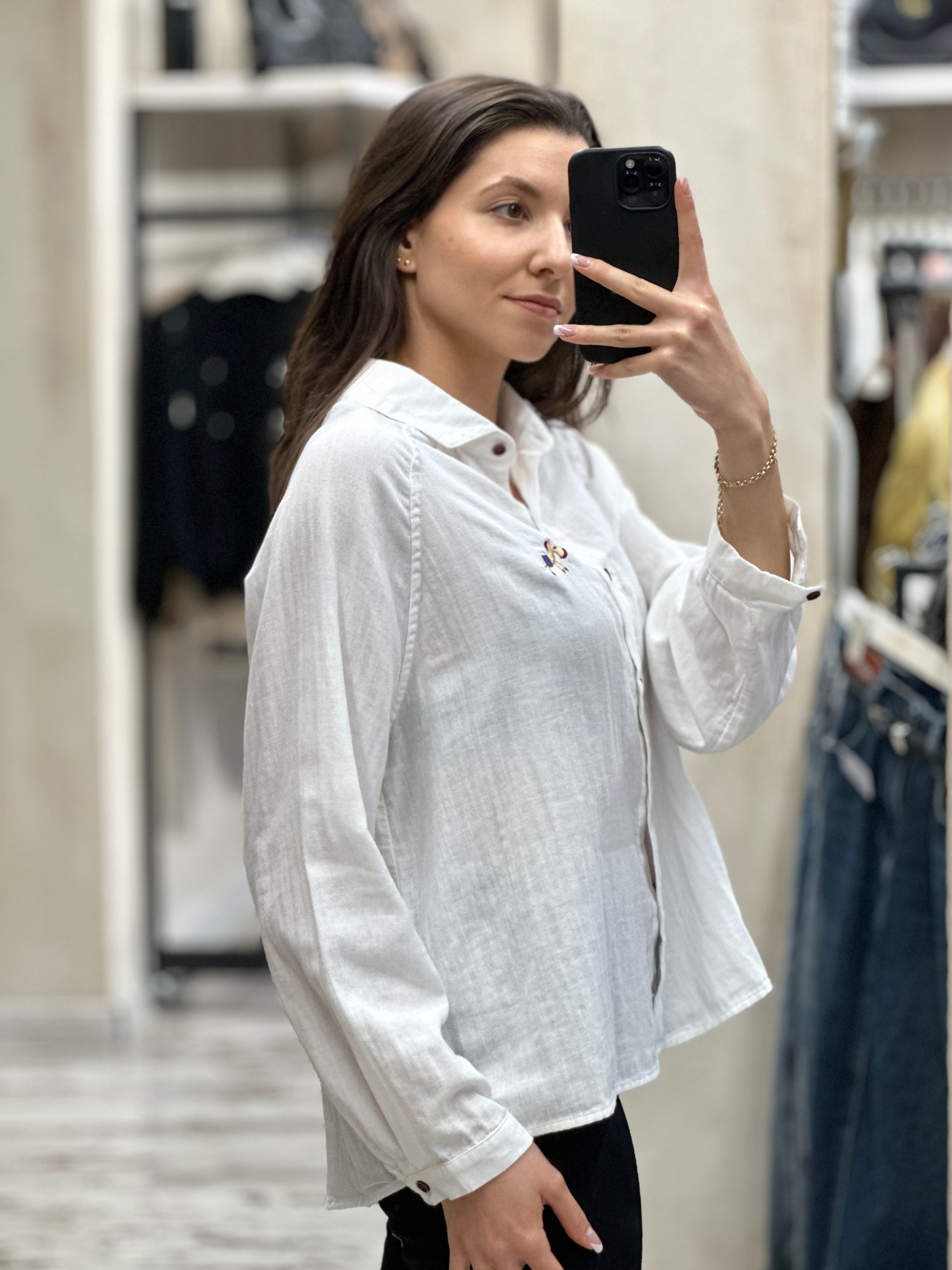 Стилна памучна риза с класическа яка и закопчаване с копчета, изработена от лека и приятна на допир материя. Деликатна бродерия с конче отпред придава свеж и отличителен акцент. Леко свободна кройка за комфорт и лесно комбиниране.