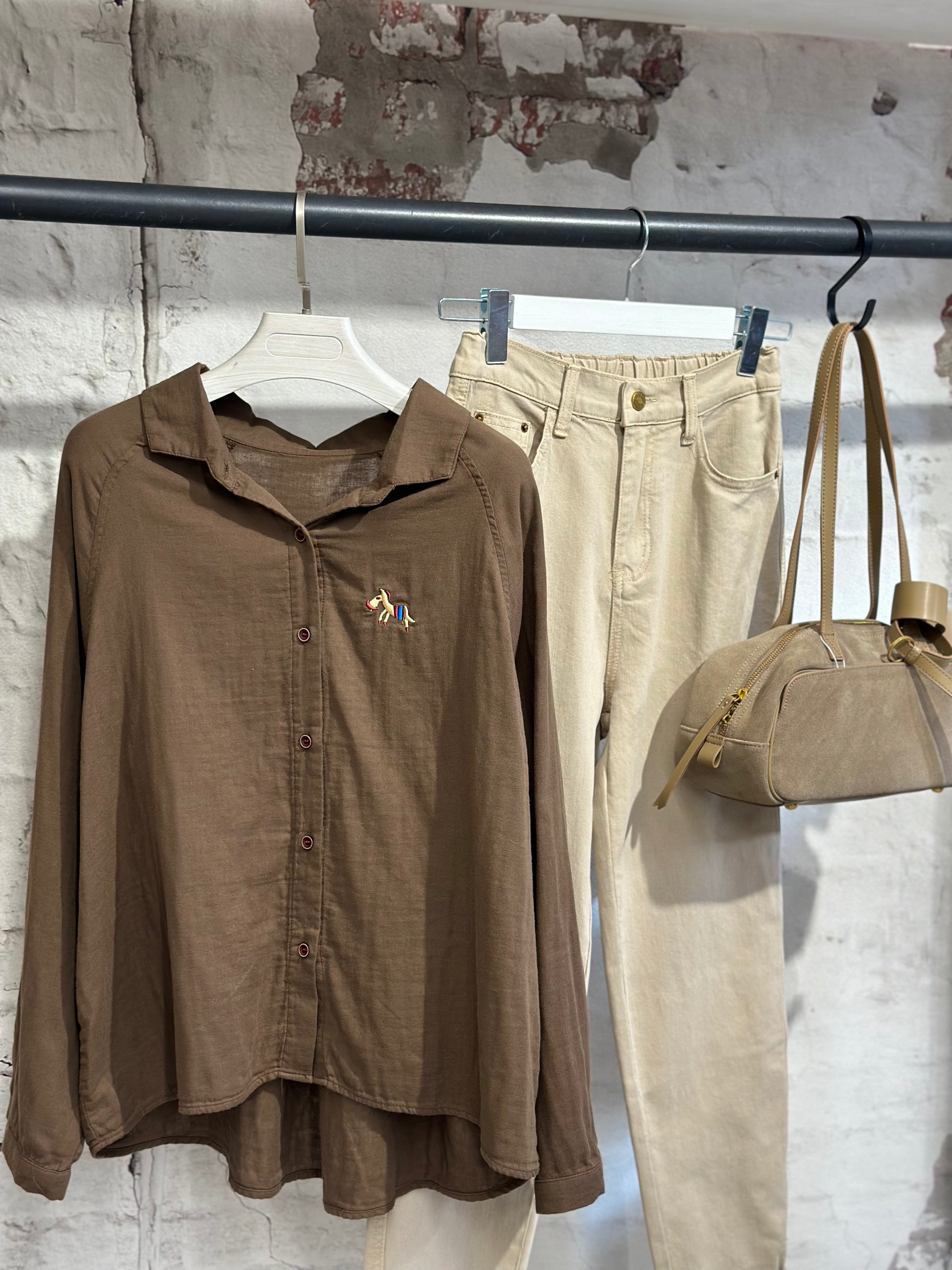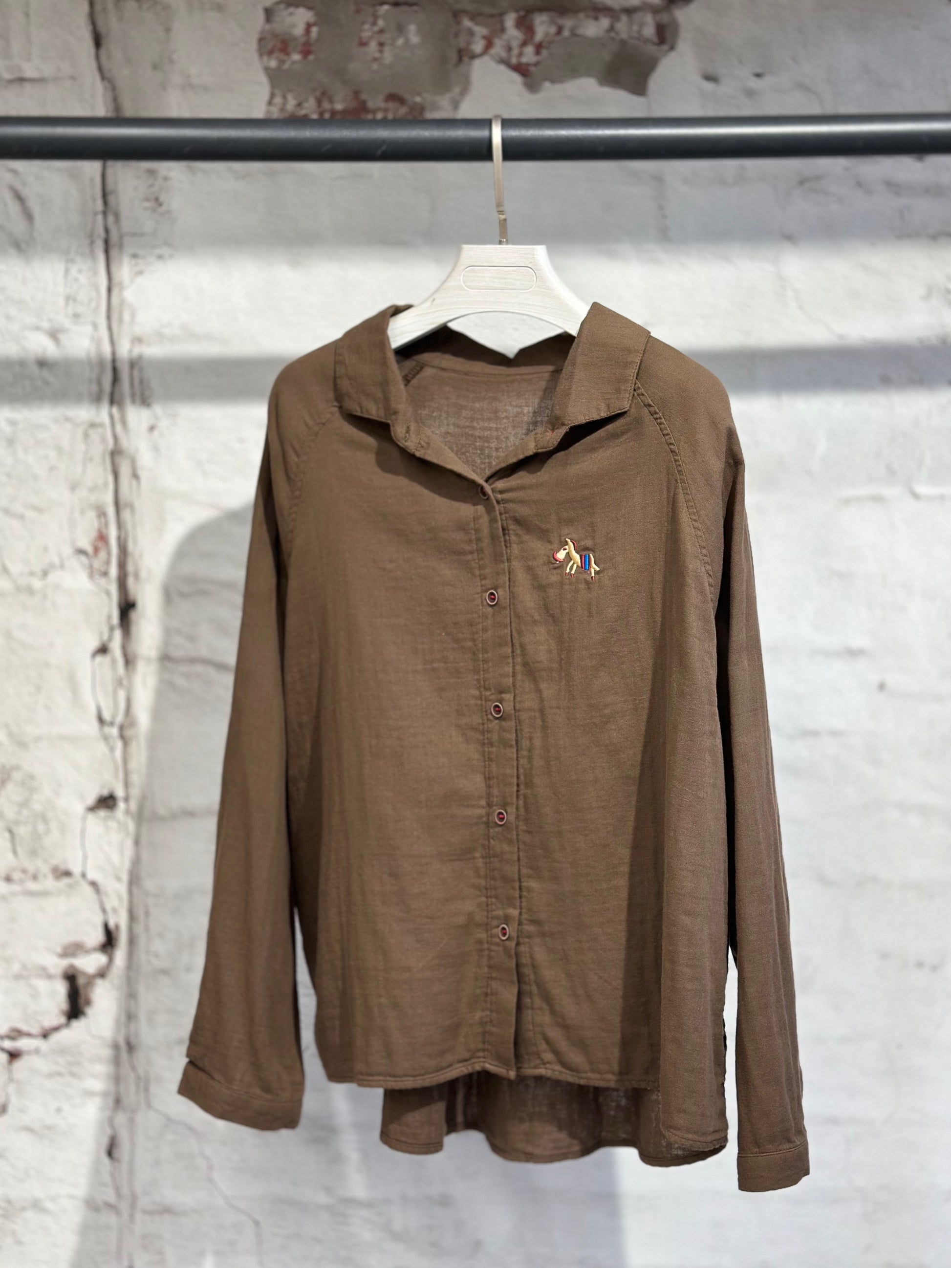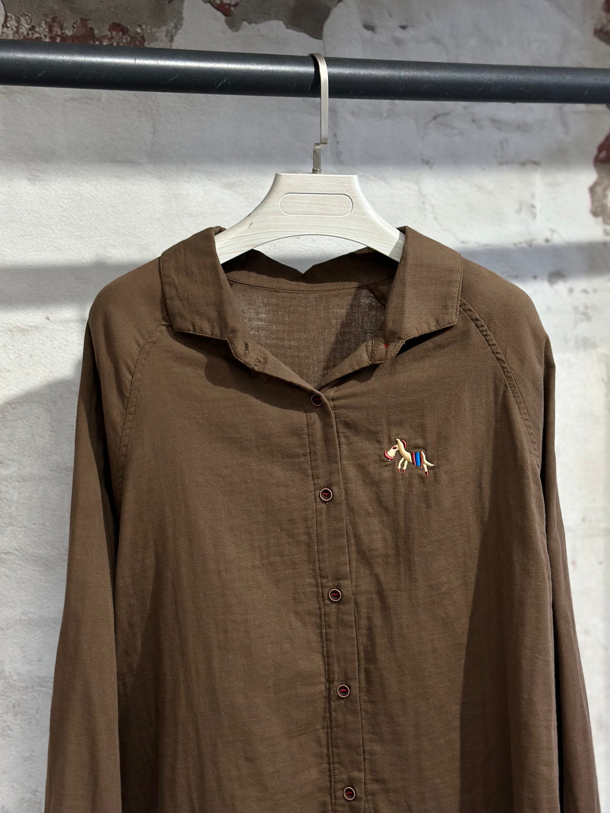 Стилна памучна риза с класическа яка и закопчаване с копчета, изработена от лека и приятна на допир материя. Деликатна бродерия с конче отпред придава свеж и отличителен акцент. Леко свободна кройка за комфорт и лесно комбиниране.