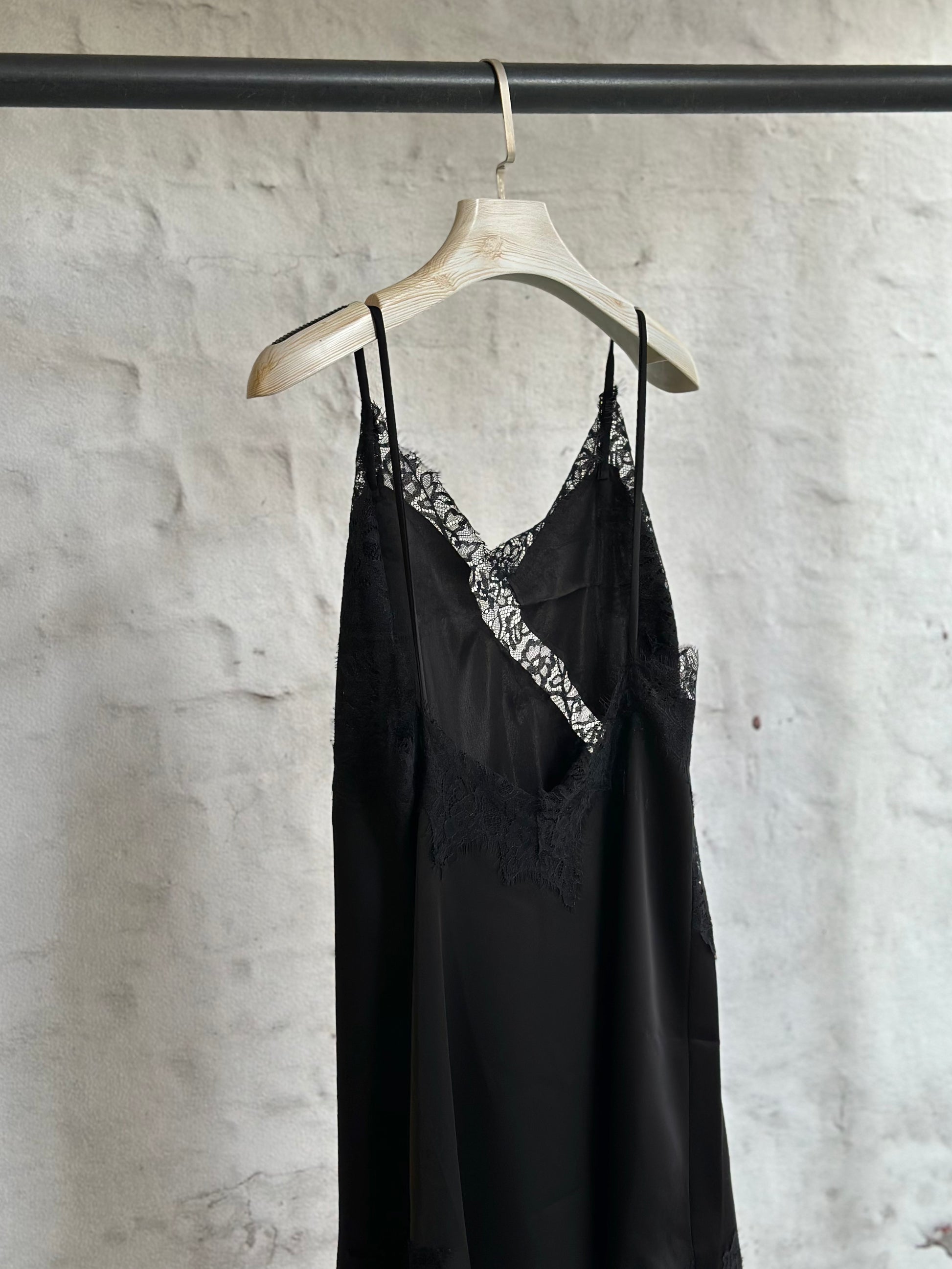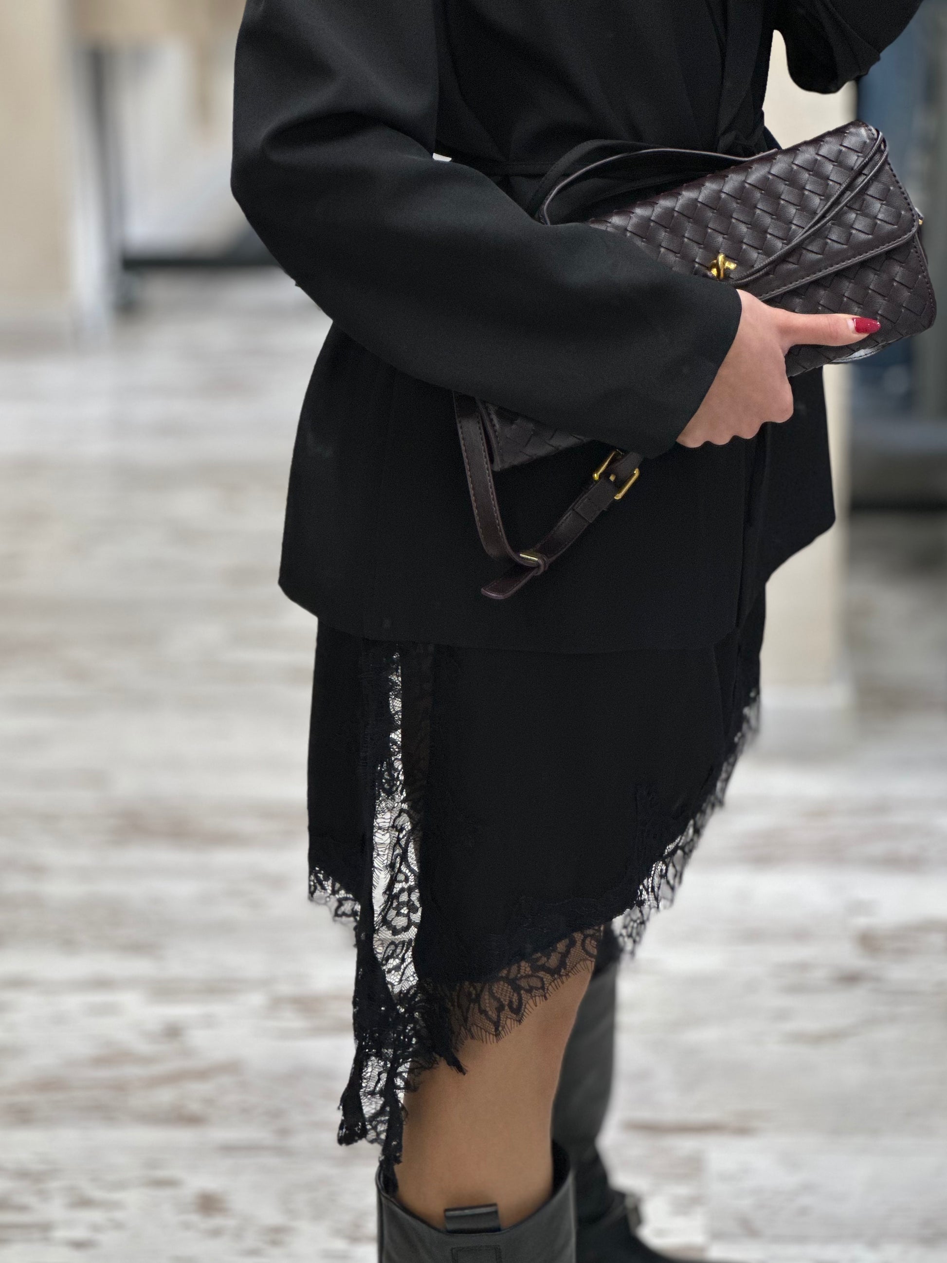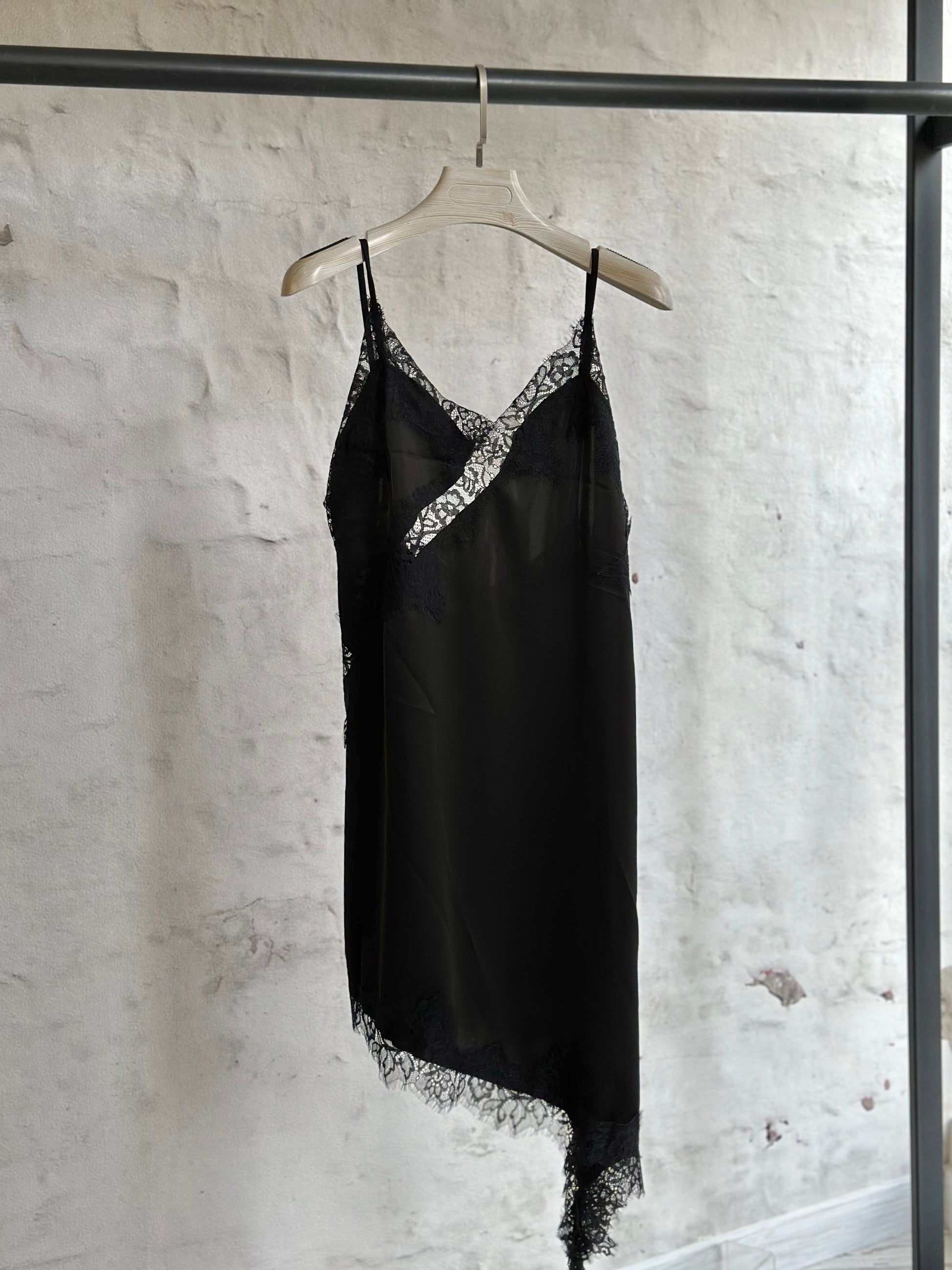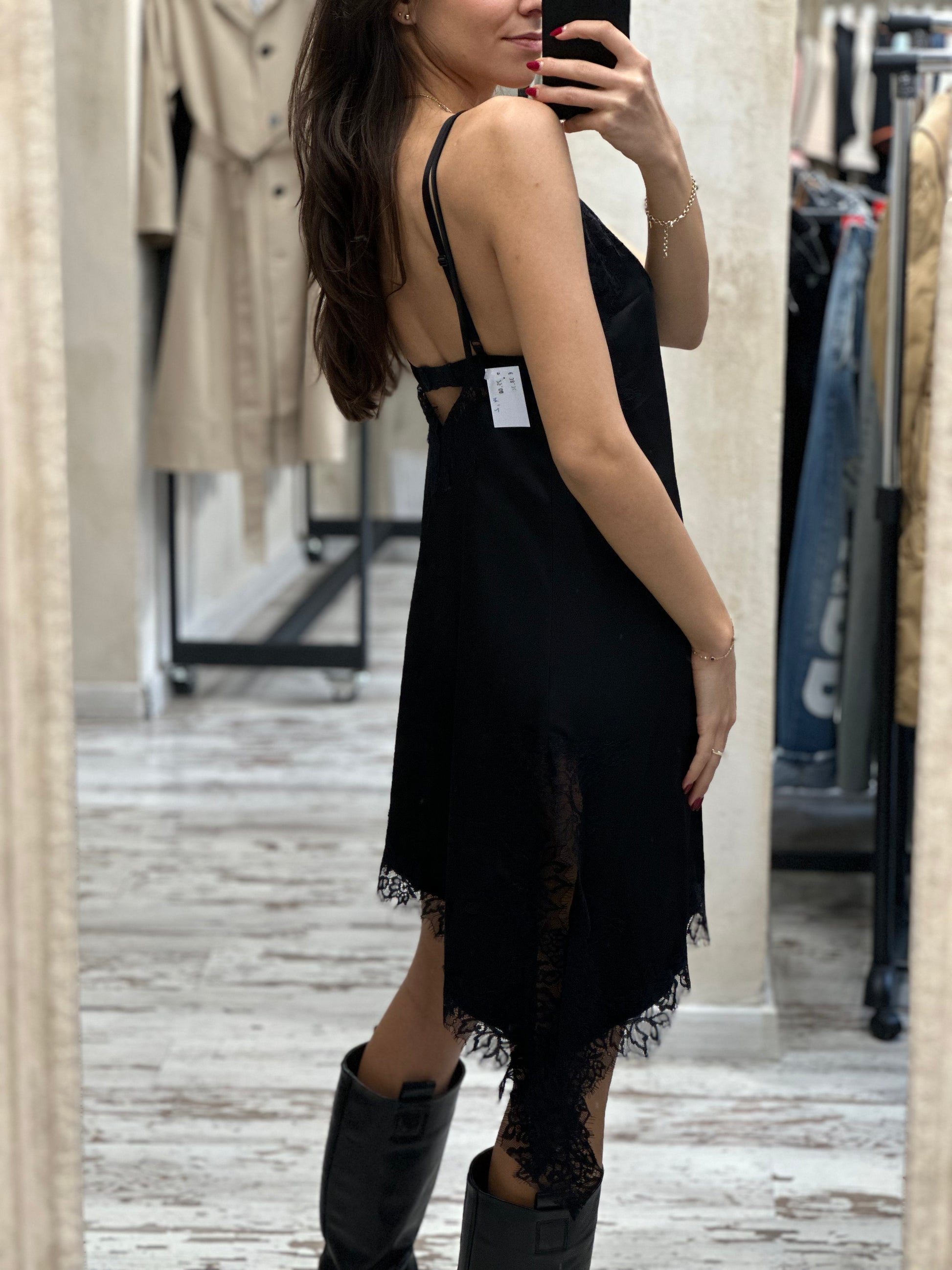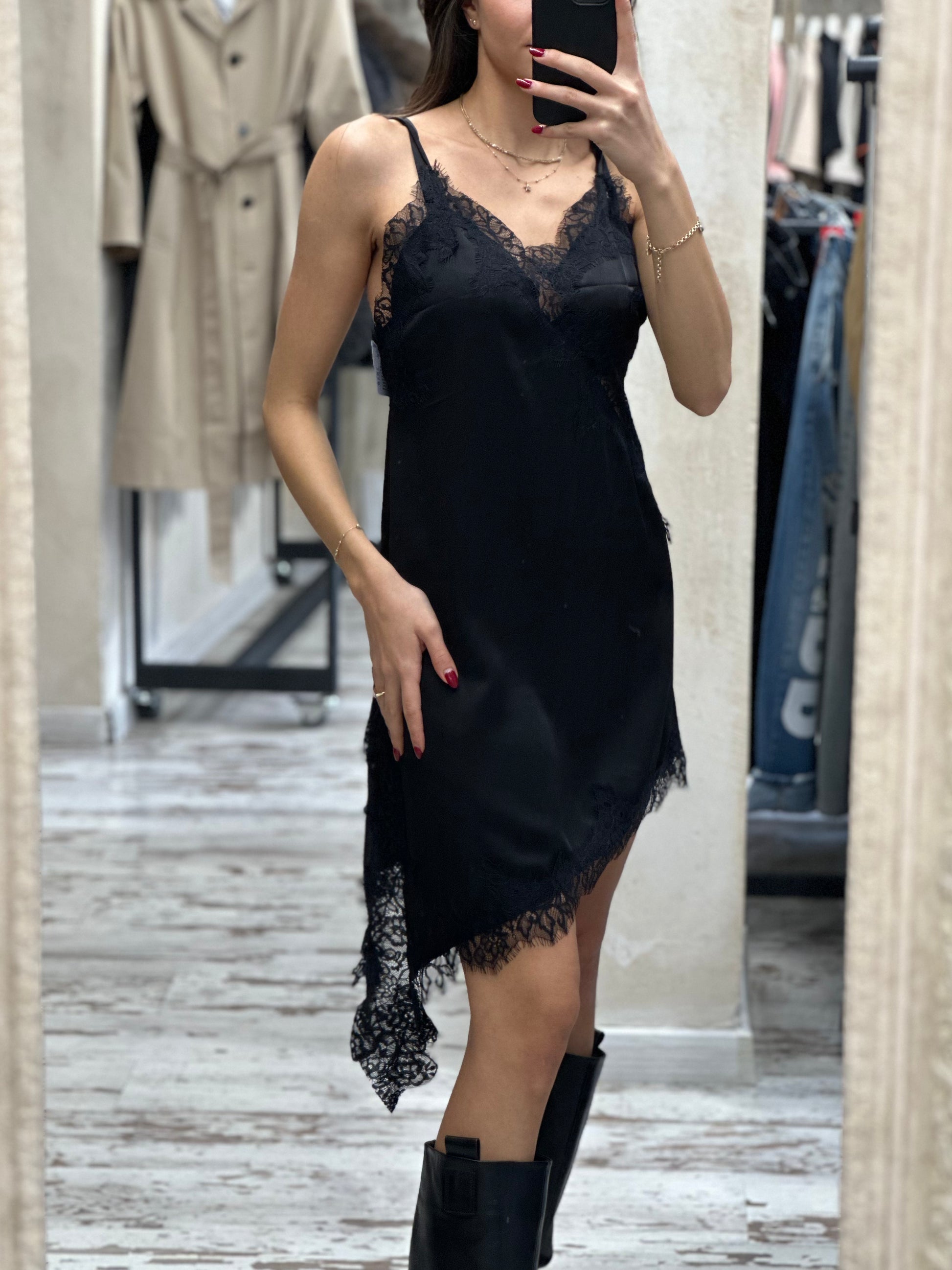 Лека, елегантна и изискана сатенена рокля с дантела, която впечатлява с луксозен блясък и деликатни дантелени акценти по деколтето и подгъва. Меката сатенена материя пада красиво по тялото, а асиметричната линия добавя модерно усещане. Моделът е достатъчно универсален, за да се носи както самостоятелно, така и стилно комбиниран върху дънки за по-небрежна, но изключително шик визия.