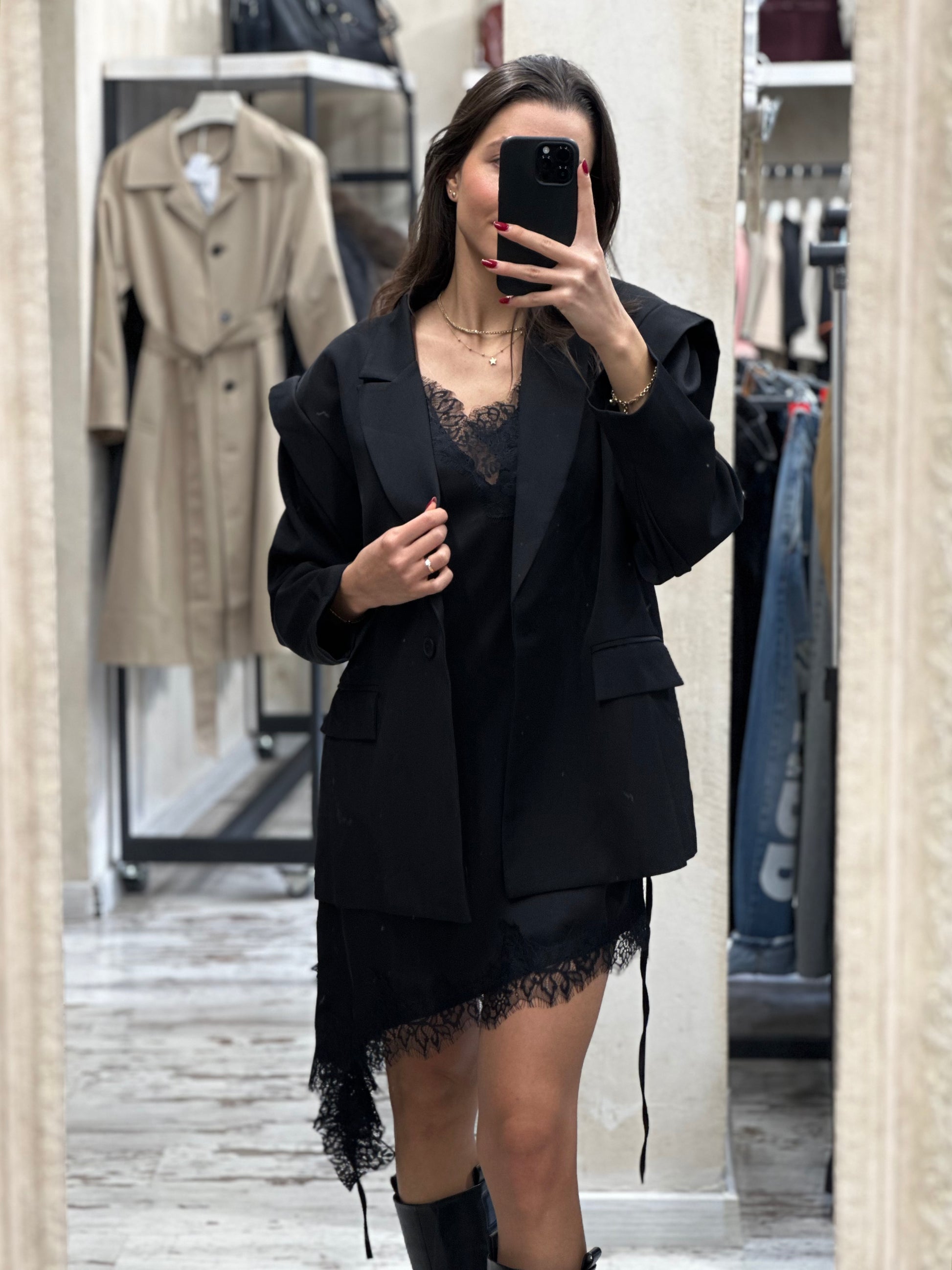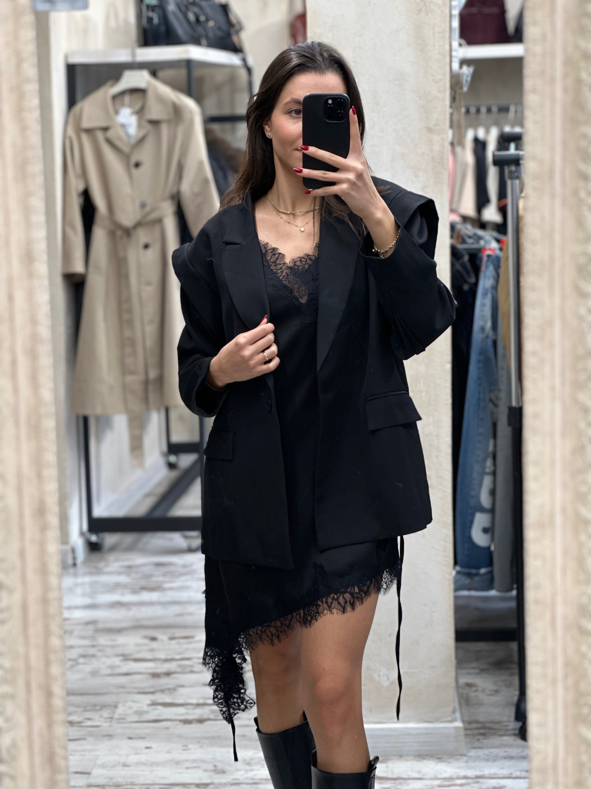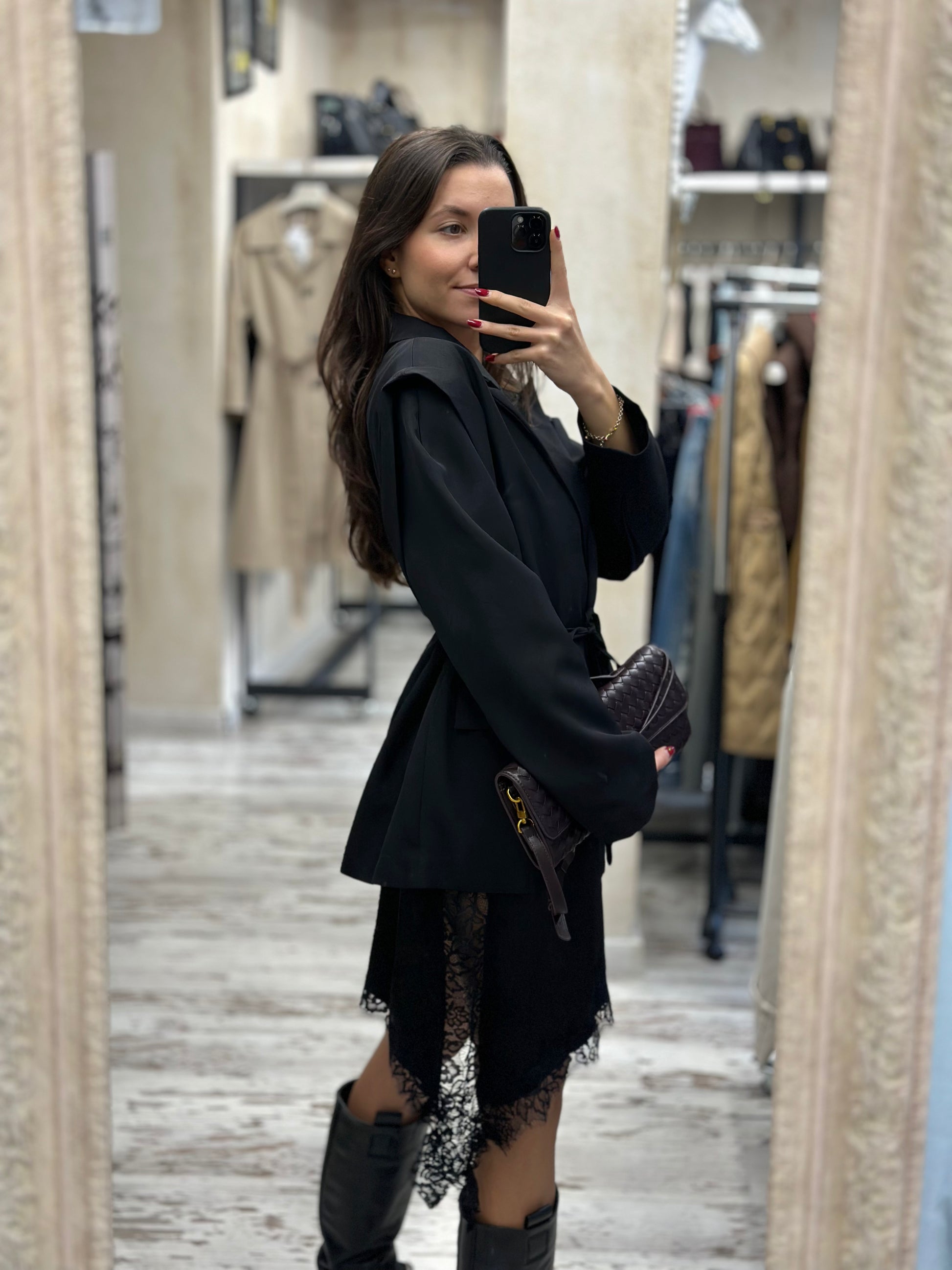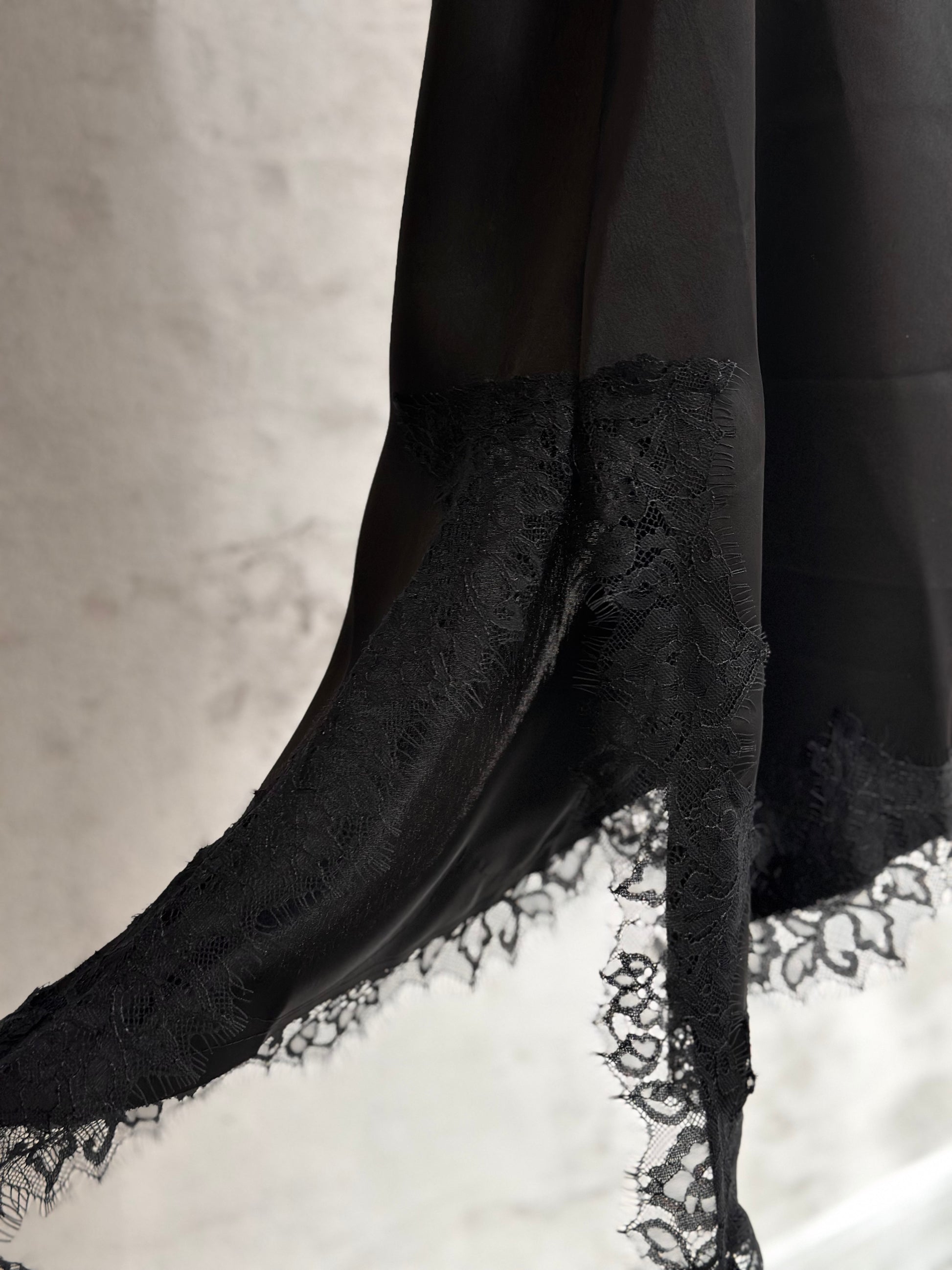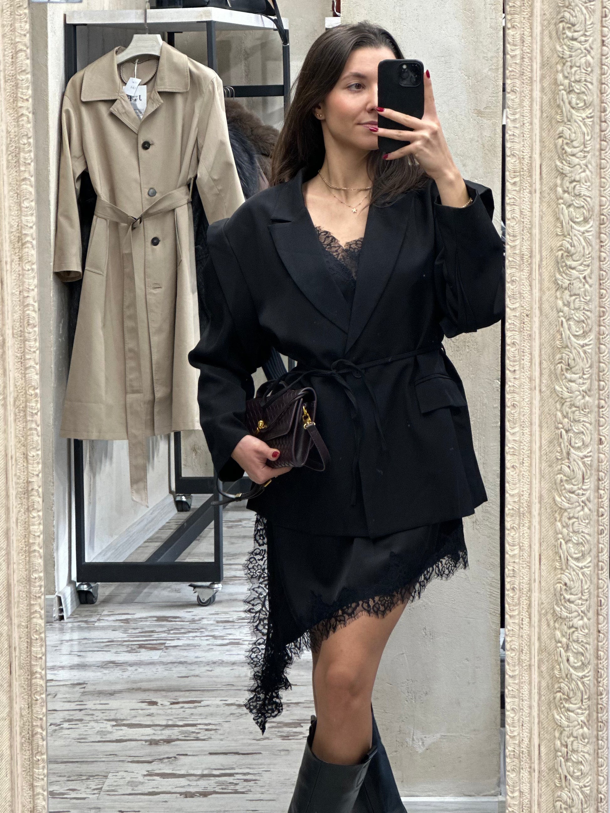 Лека, елегантна и изискана сатенена рокля с дантела, която впечатлява с луксозен блясък и деликатни дантелени акценти по деколтето и подгъва. Меката сатенена материя пада красиво по тялото, а асиметричната линия добавя модерно усещане. Моделът е достатъчно универсален, за да се носи както самостоятелно, така и стилно комбиниран върху дънки за по-небрежна, но изключително шик визия.