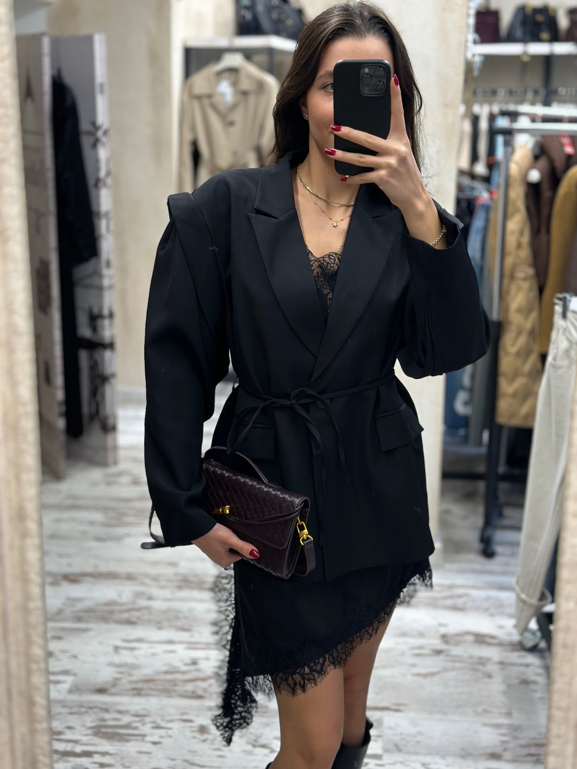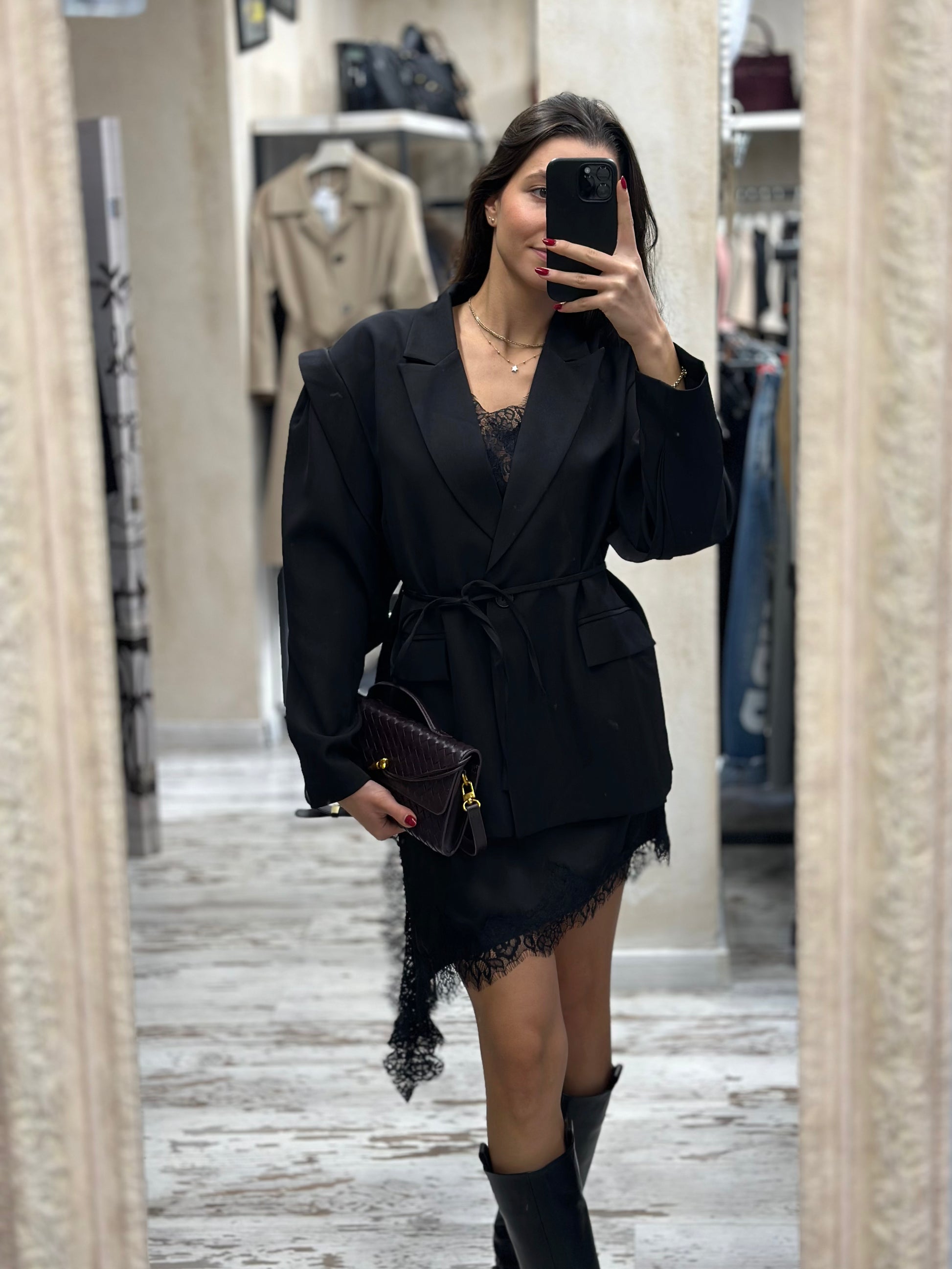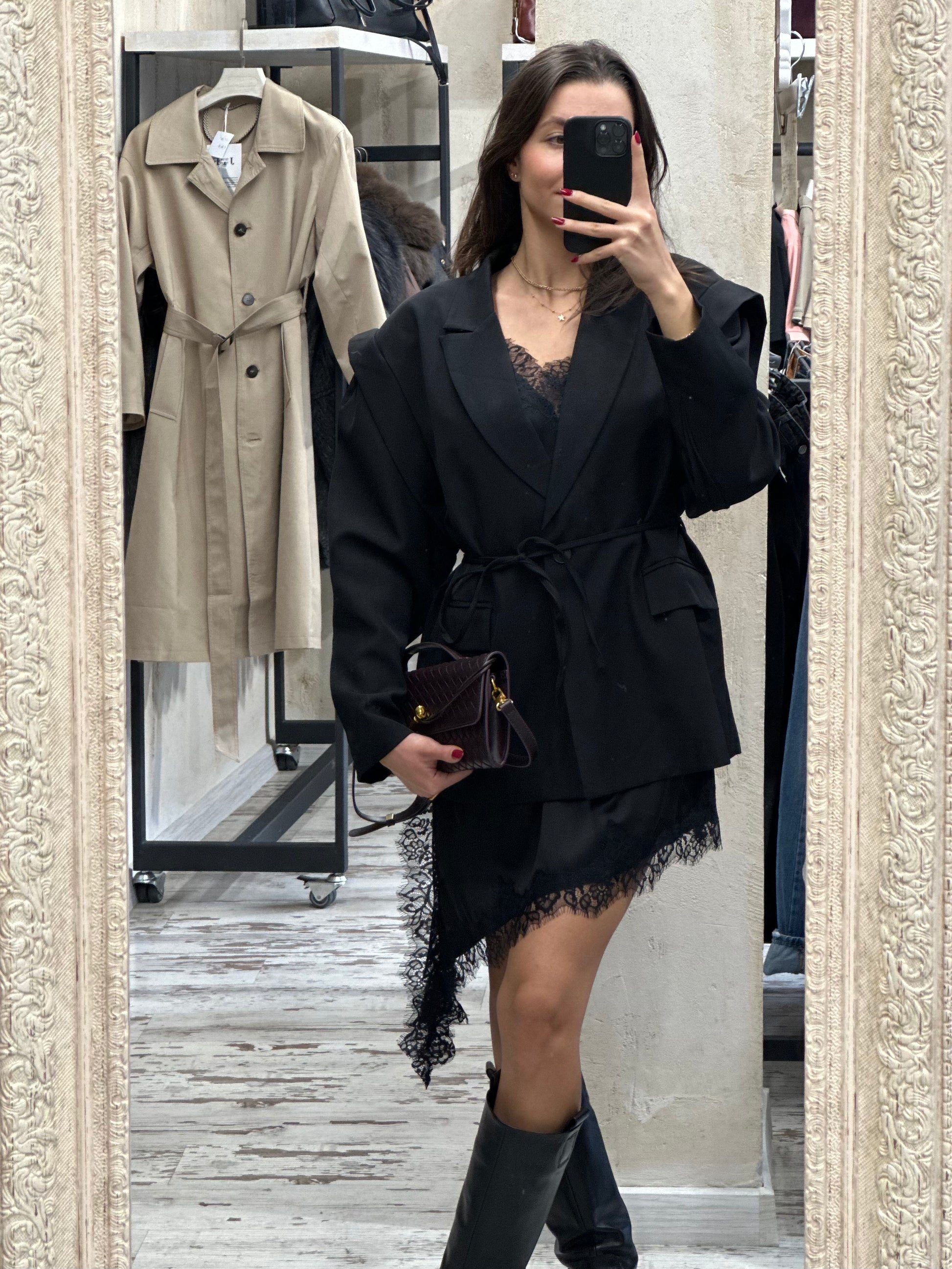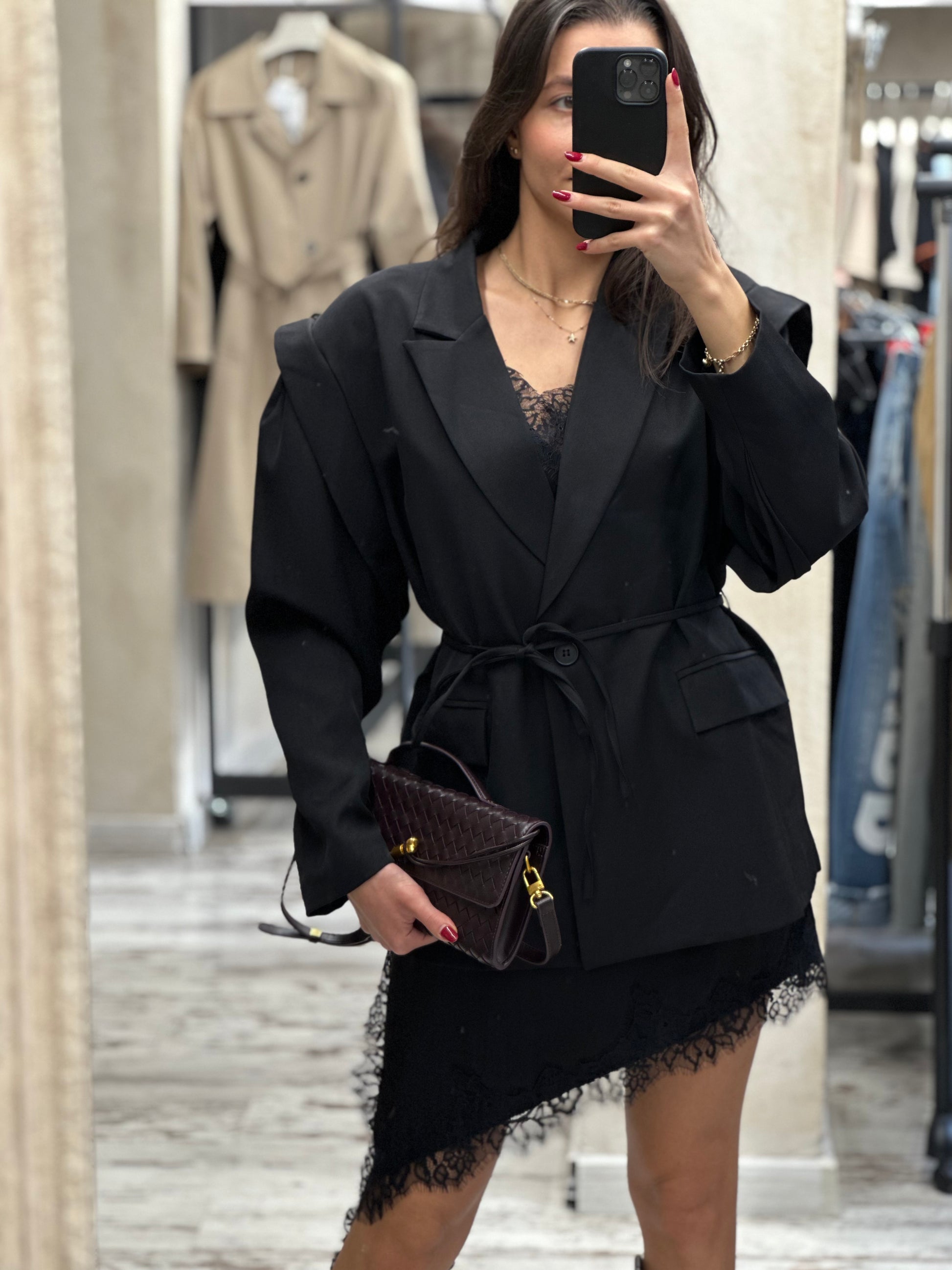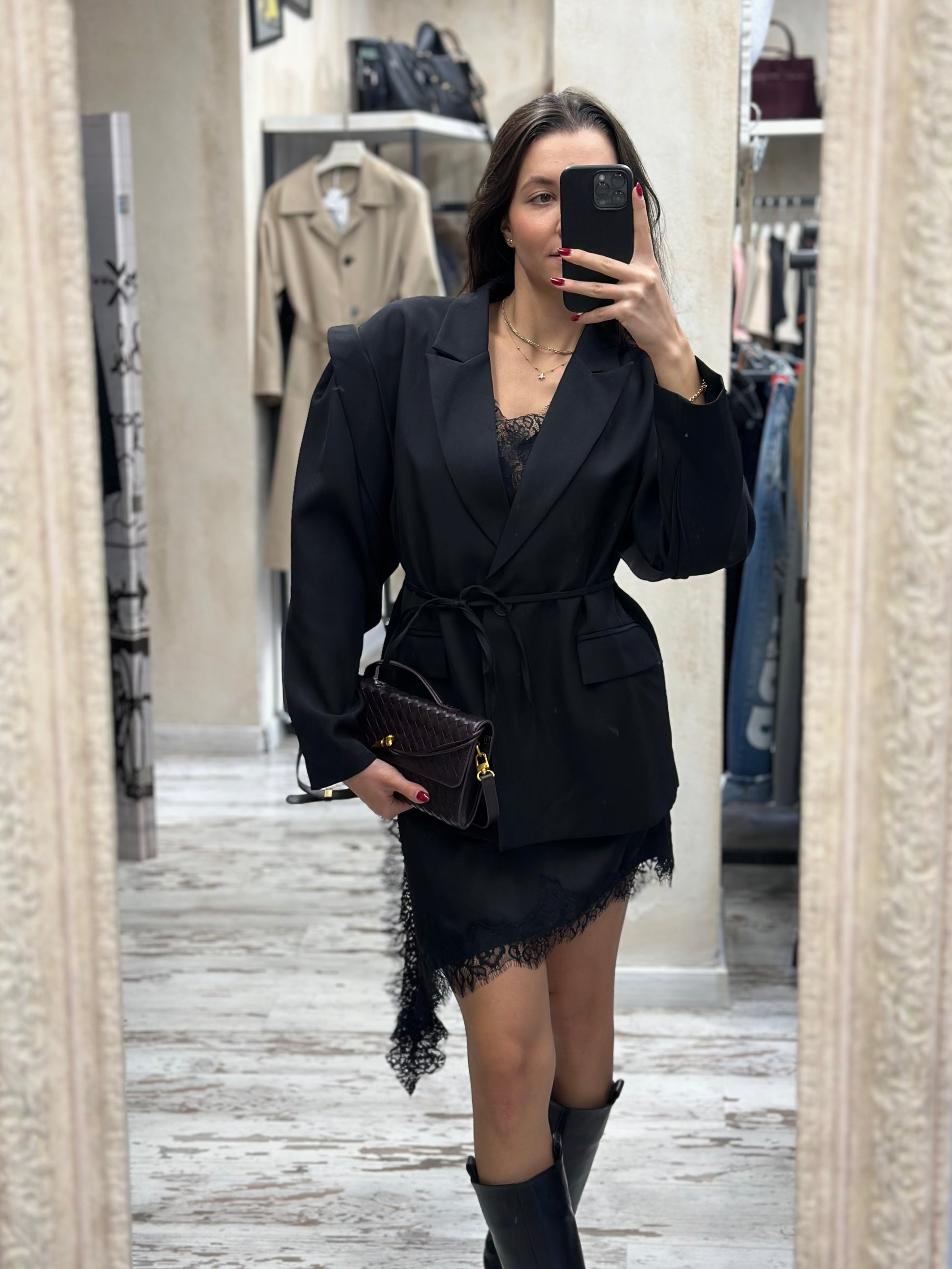 Лека, елегантна и изискана сатенена рокля с дантела, която впечатлява с луксозен блясък и деликатни дантелени акценти по деколтето и подгъва. Меката сатенена материя пада красиво по тялото, а асиметричната линия добавя модерно усещане. Моделът е достатъчно универсален, за да се носи както самостоятелно, така и стилно комбиниран върху дънки за по-небрежна, но изключително шик визия.