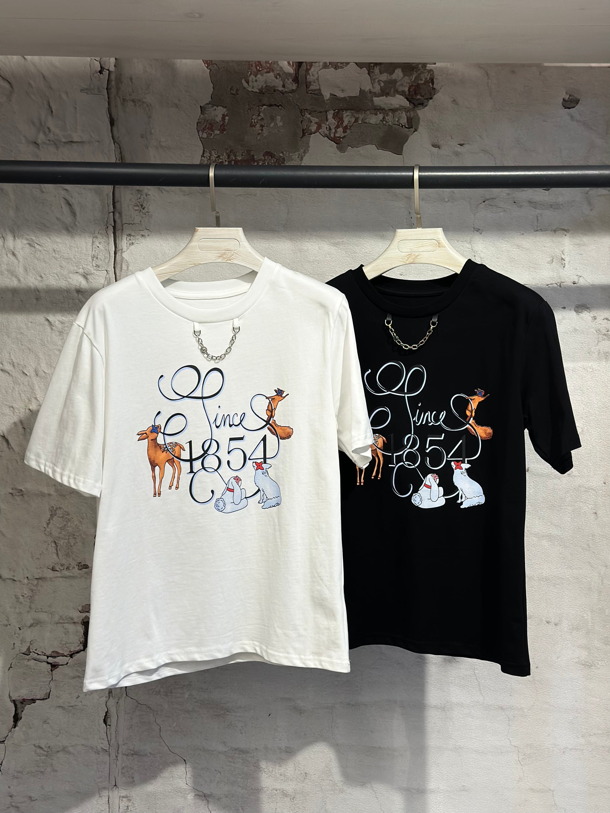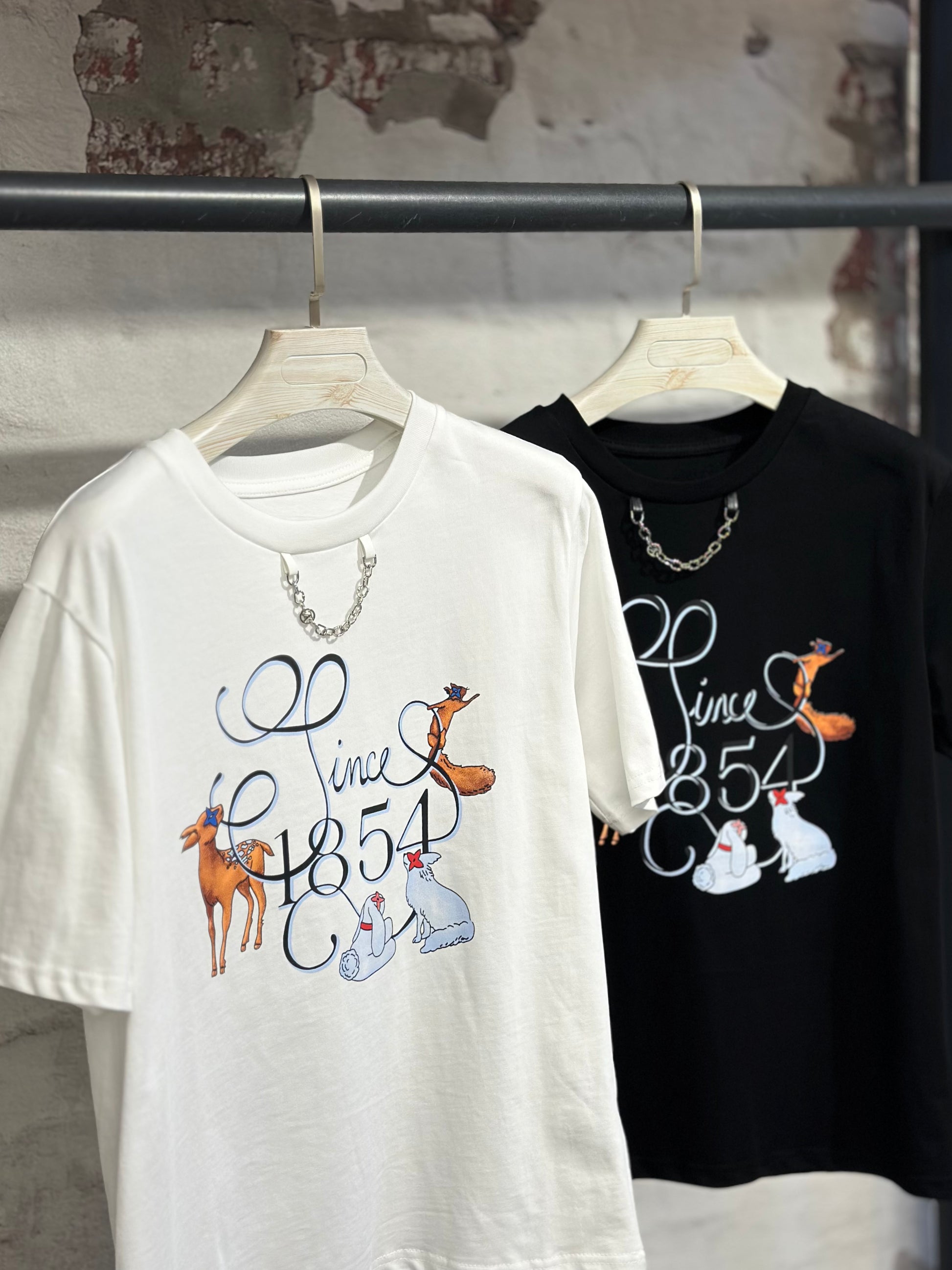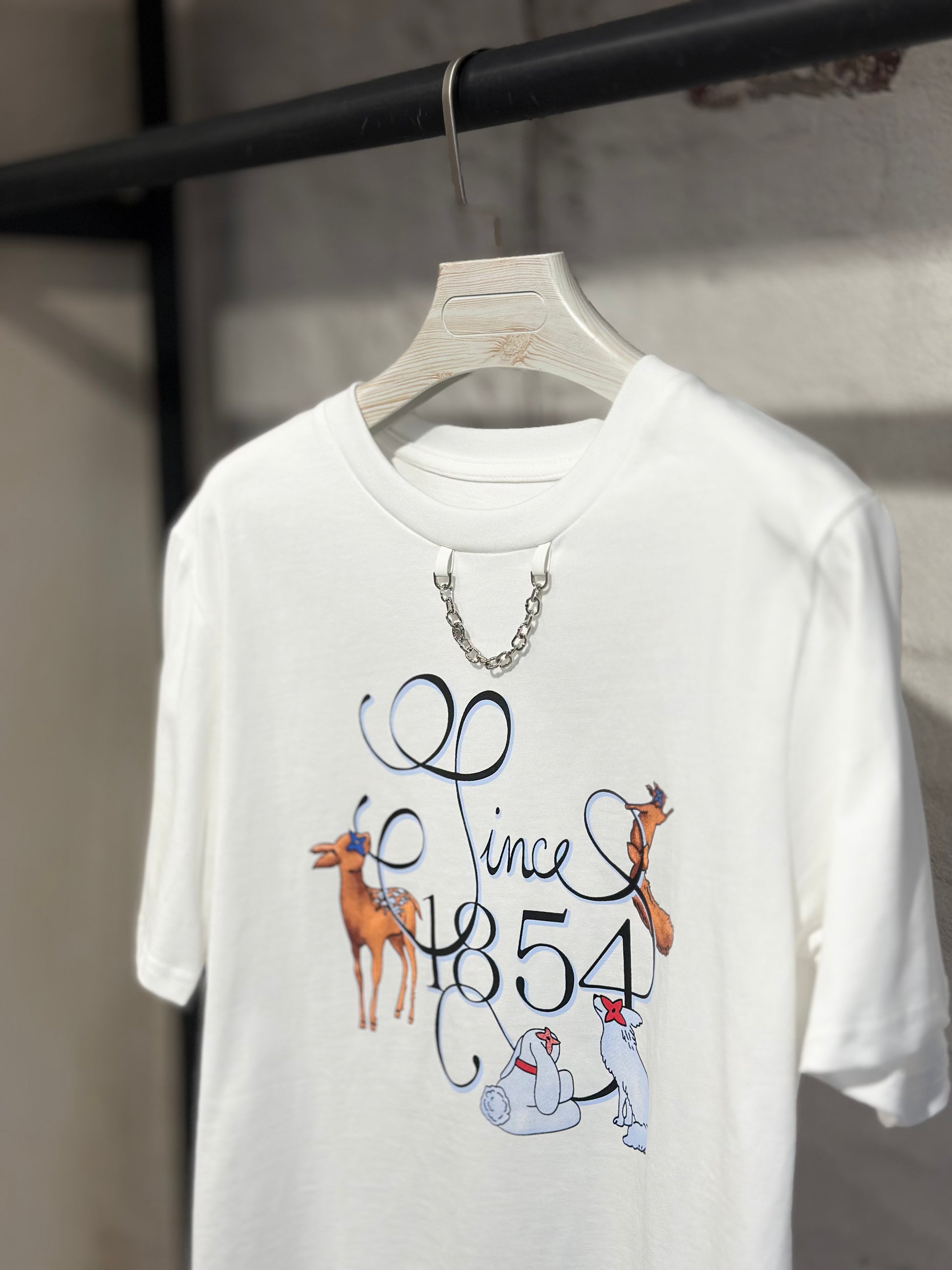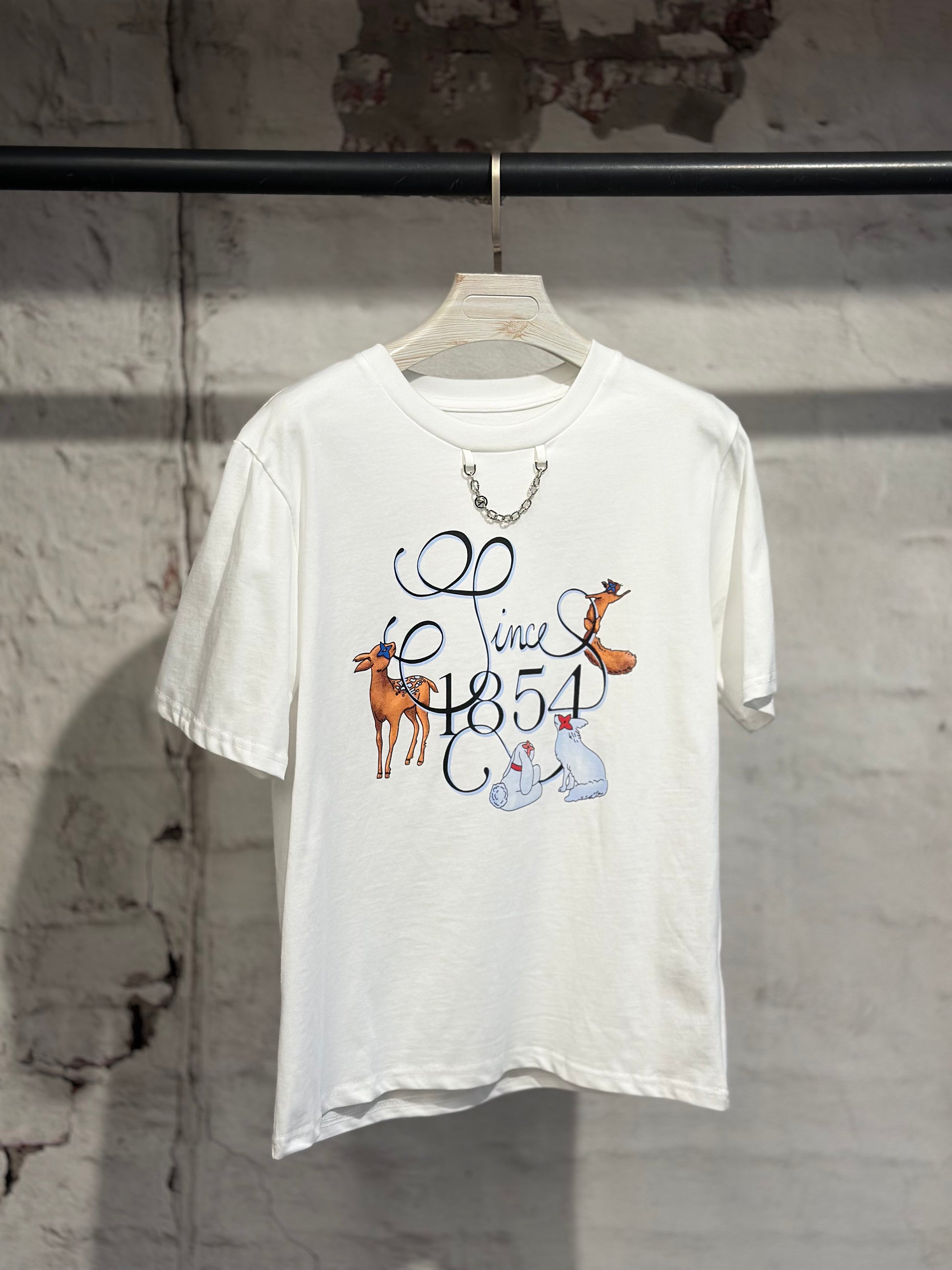 Бяла тениска с модерна, леко свободна кройка и артистичен принт с животински мотиви и надпис „Since 1854“. Стилна и удобна, подходяща за ежедневни визии с дънки, къси панталони или пола.