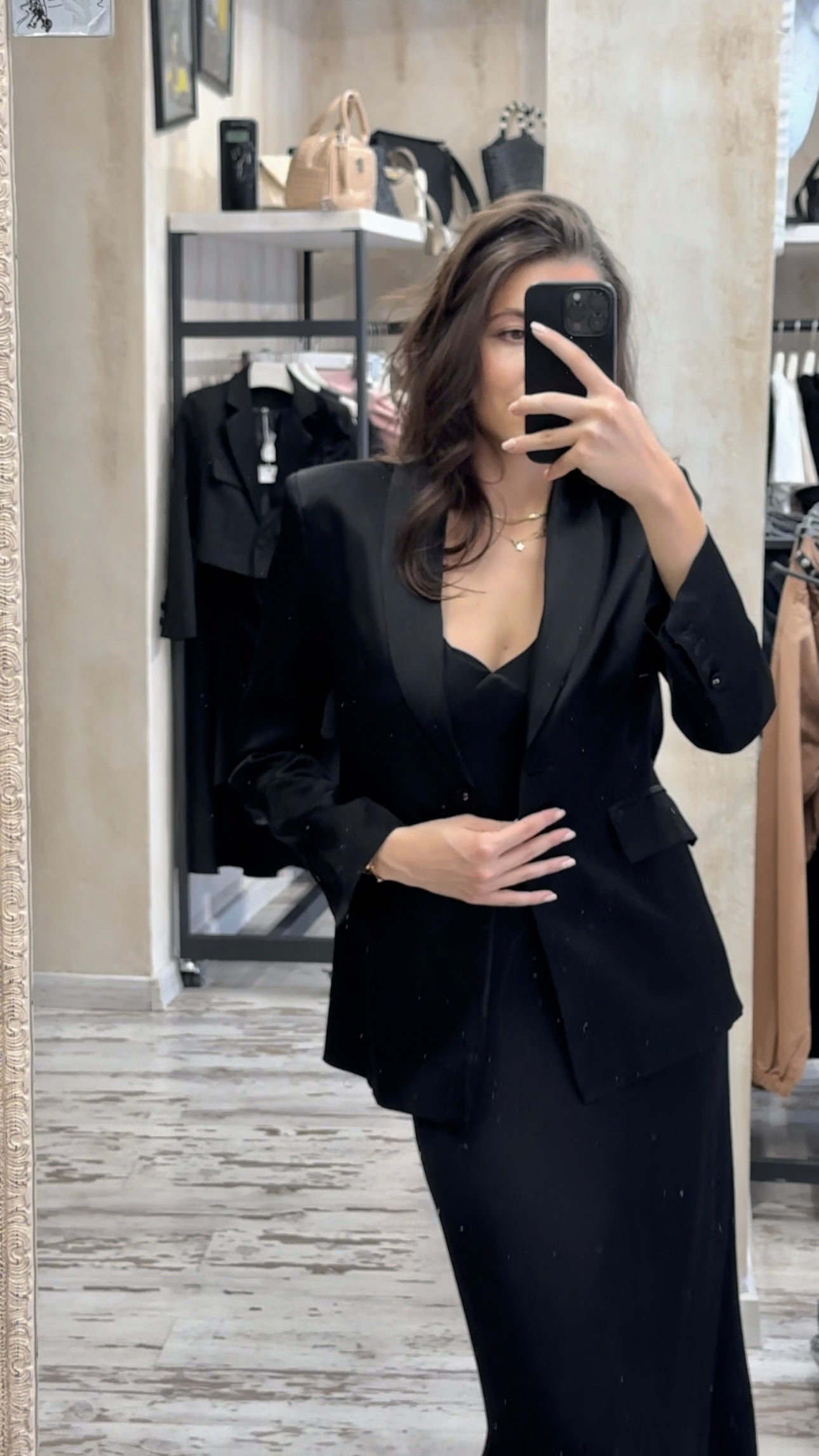 Този дамски комплект е изискано и стилно облекло, което включва сако и рокля, създавайки завършена и професионална визия. Той е перфектен за официални събития, бизнес срещи или вечерни излизания, когато изискаността и класата са от значение.
