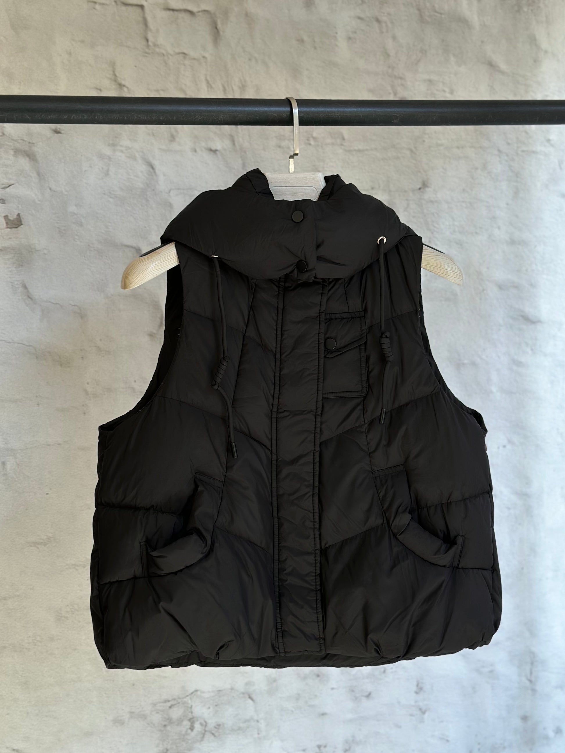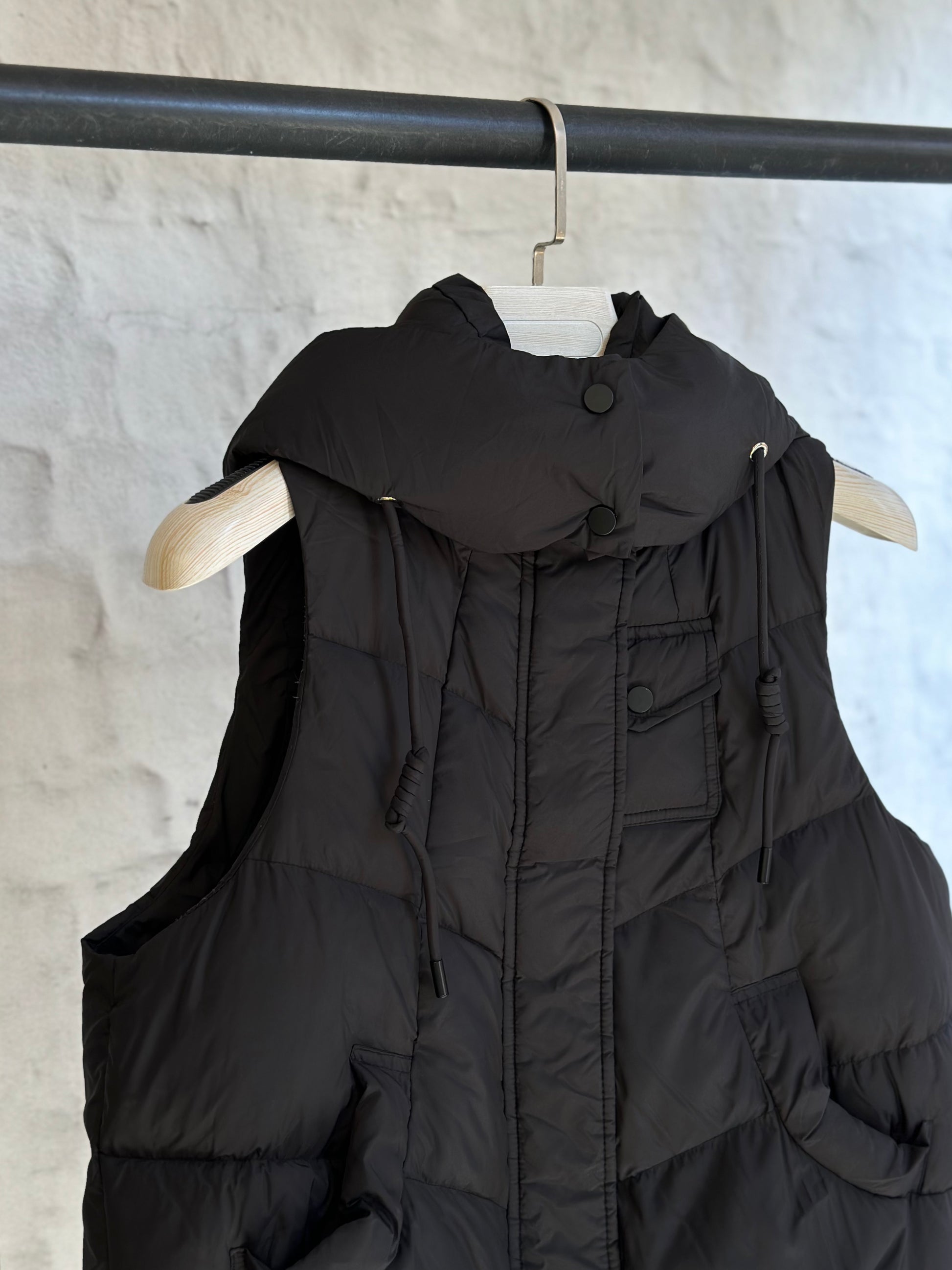 Късият елек е с пълнеж от гъши пух, който съчетава стил и функционалност. Подходящ за есенни разходки. с добавени джобове и качулка, той е идеалното решение за всяка активна жена.