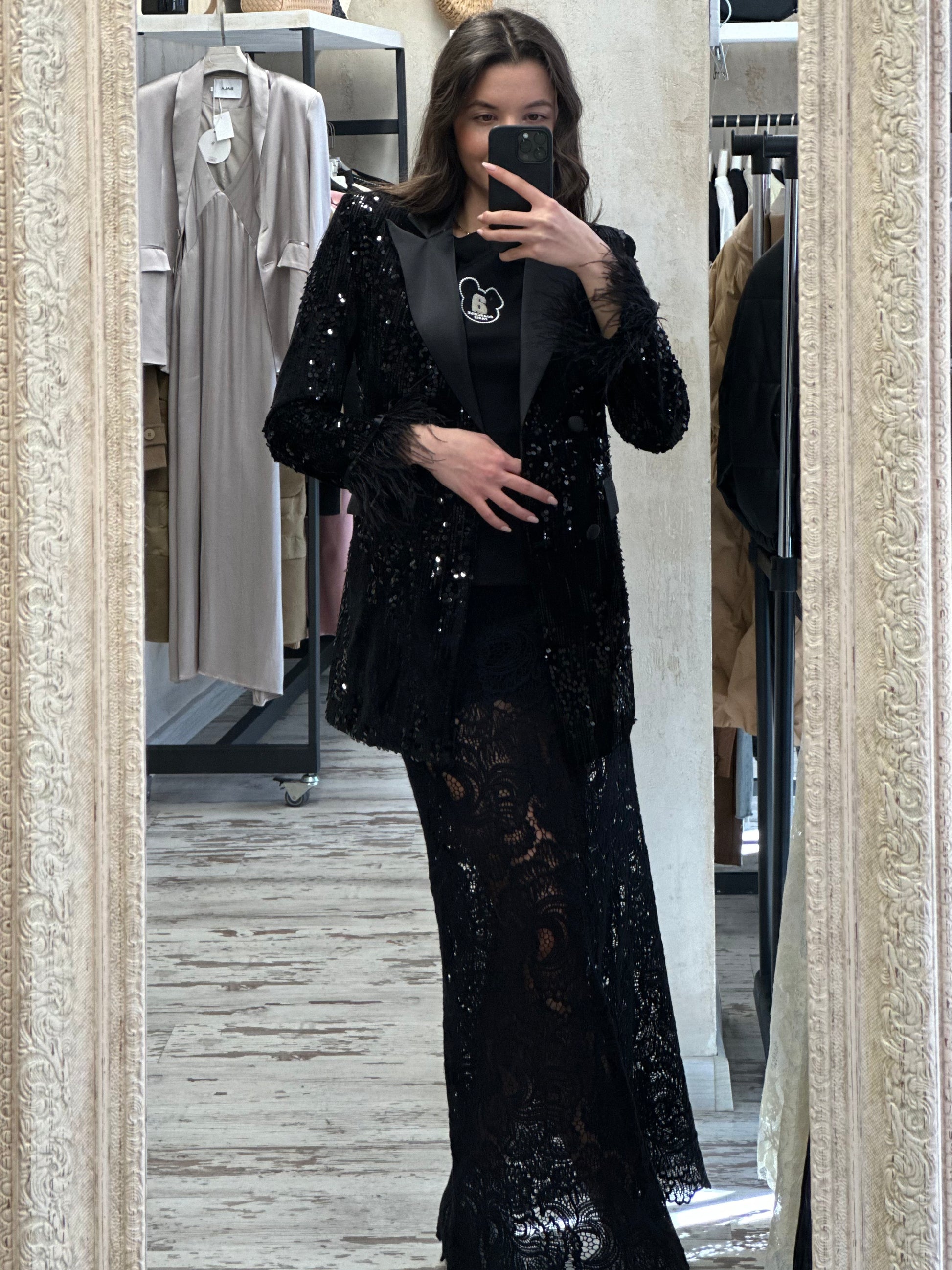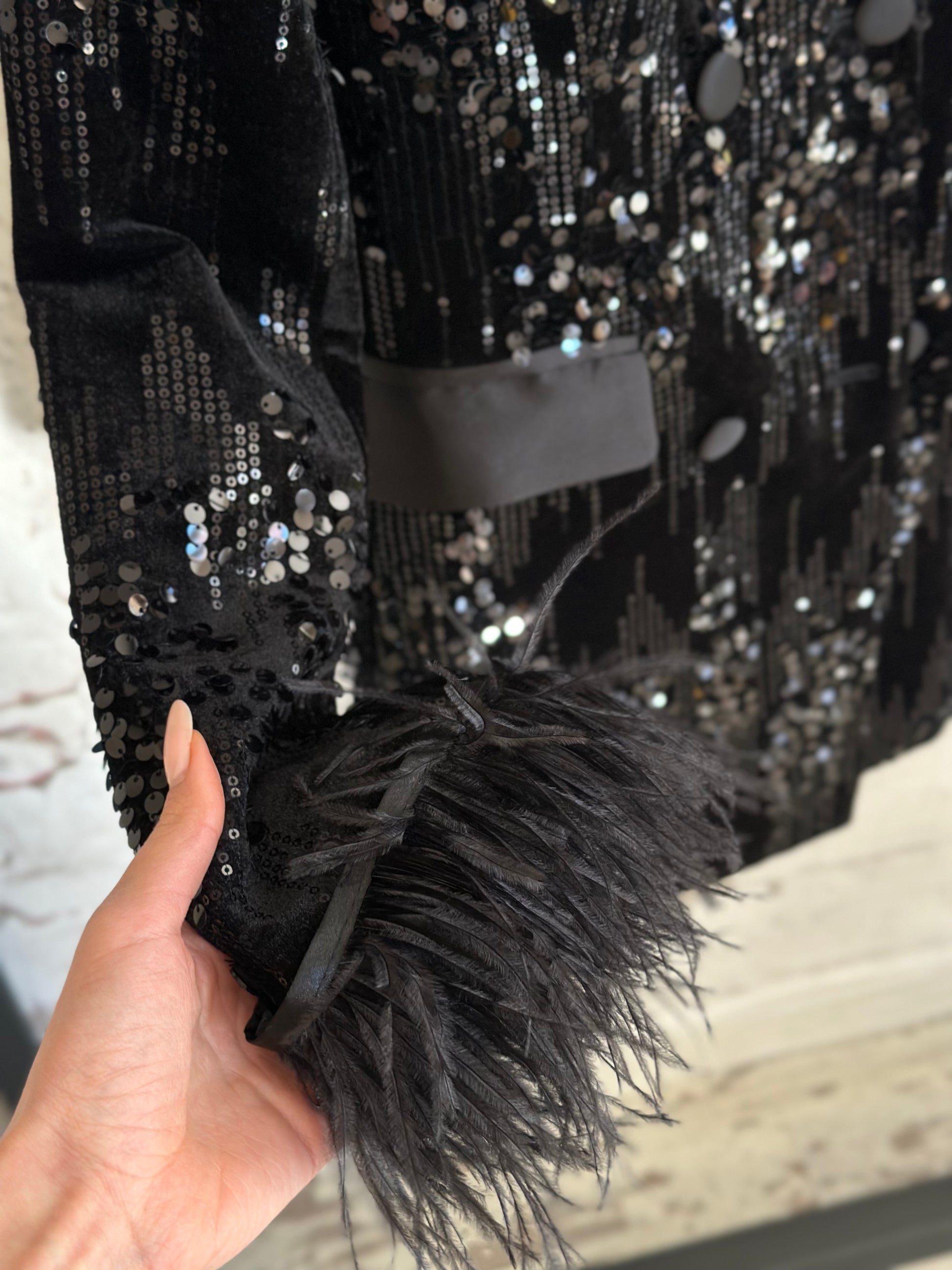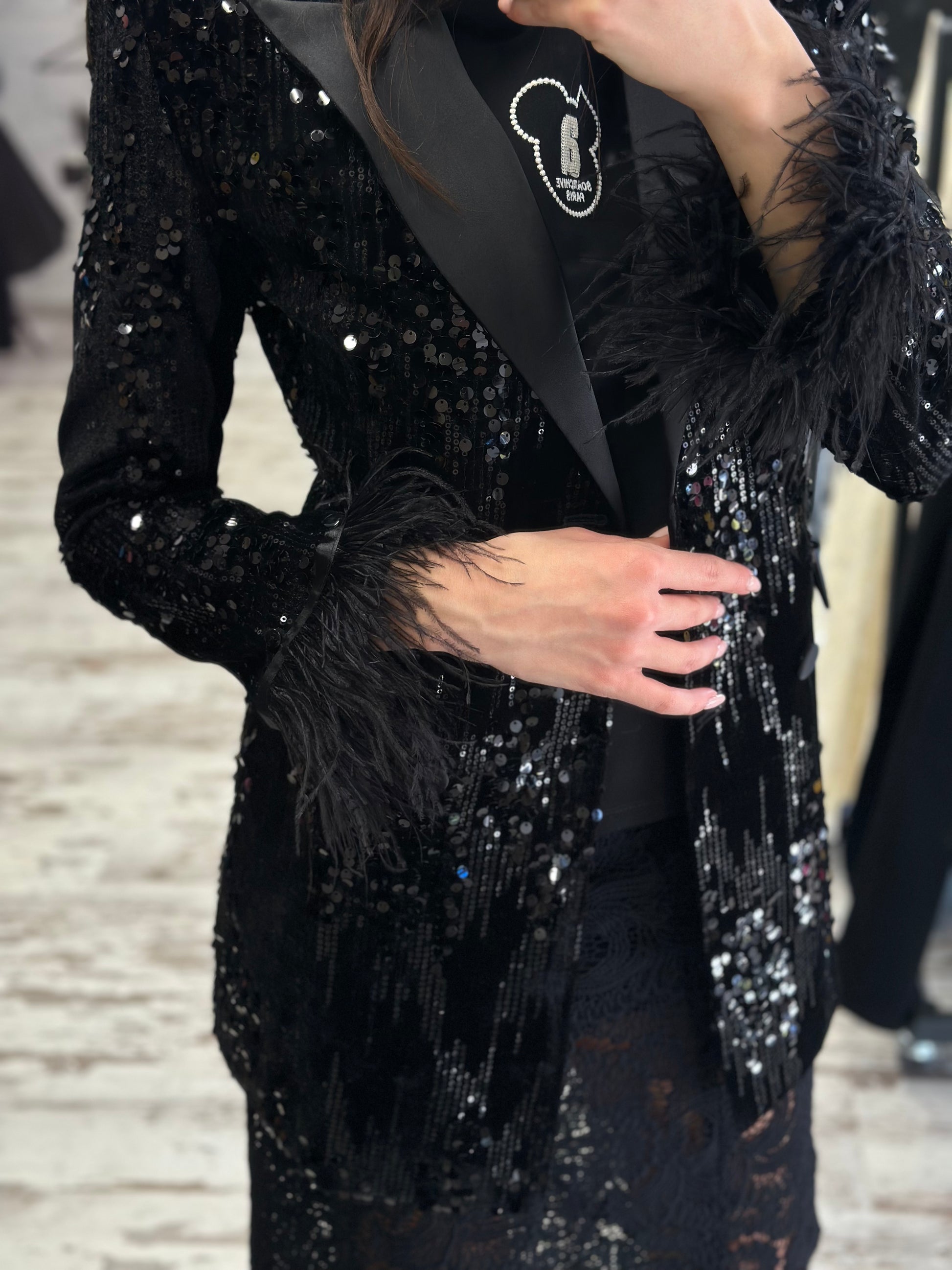 Такова сако може да се носи както за вечерни събития, така и за официални срещи, комбинирано с елегантна пола или панталони и високи обувки. Перата добавят екстравагантност и характер на облеклото, превръщайки го в уникален акцент.