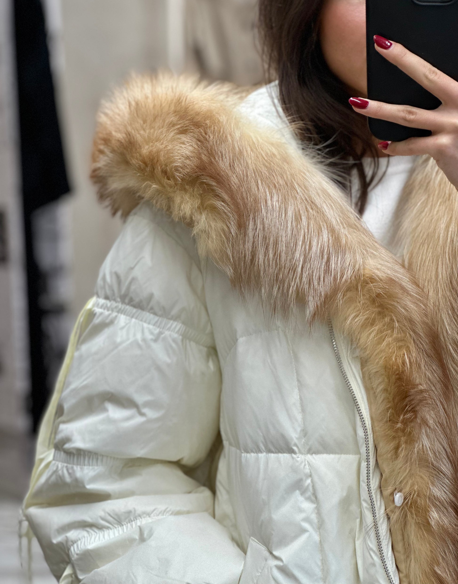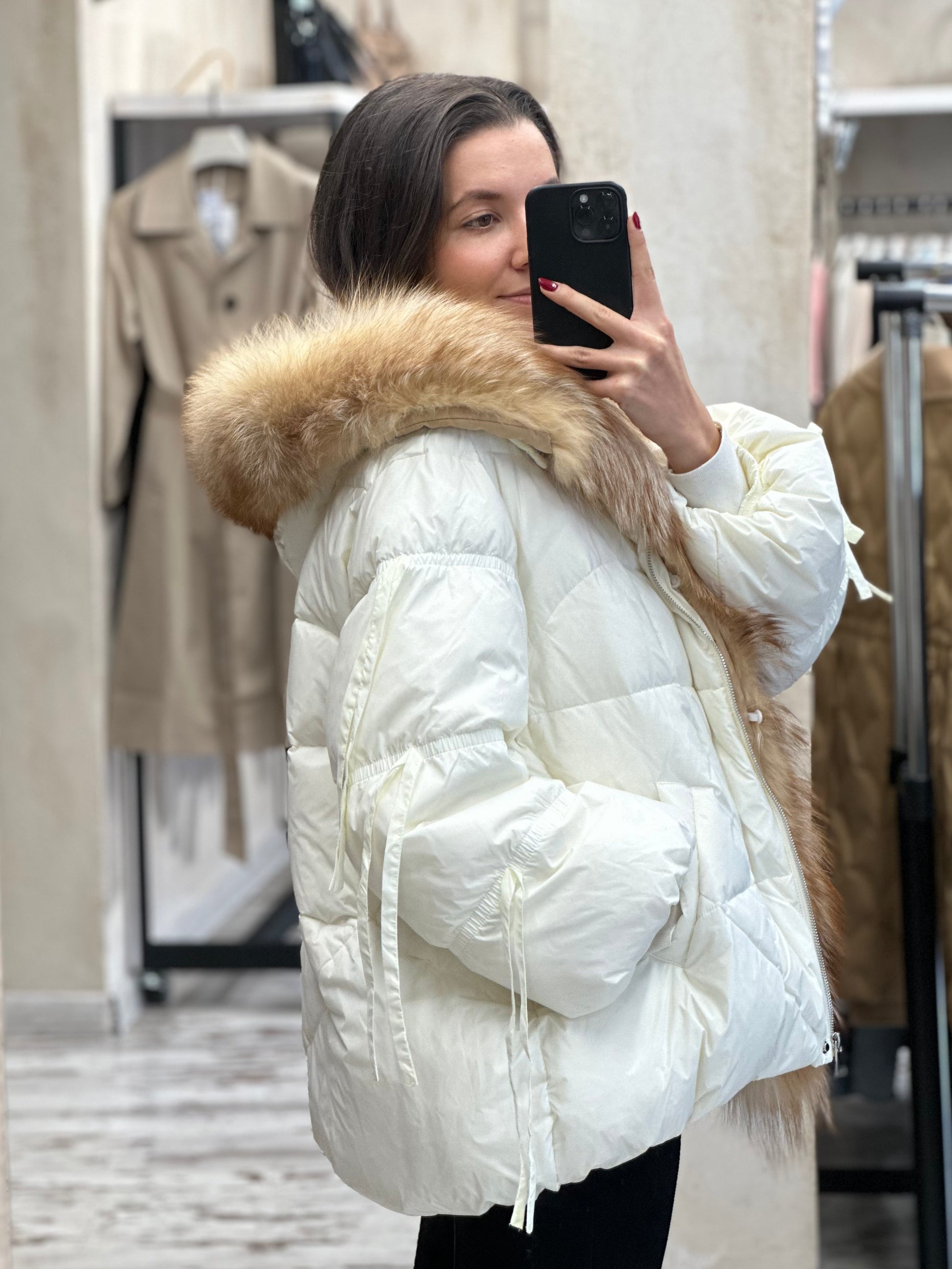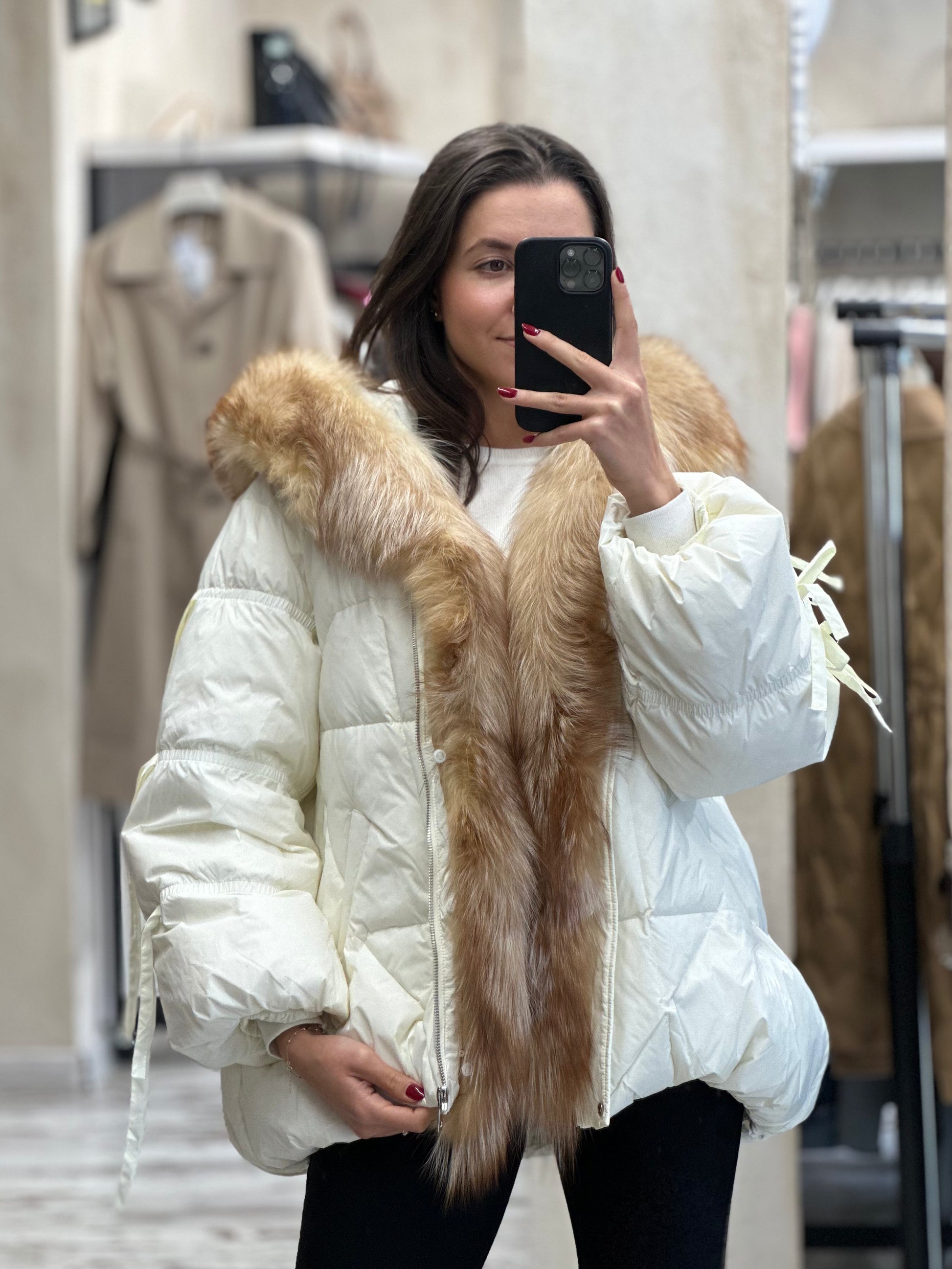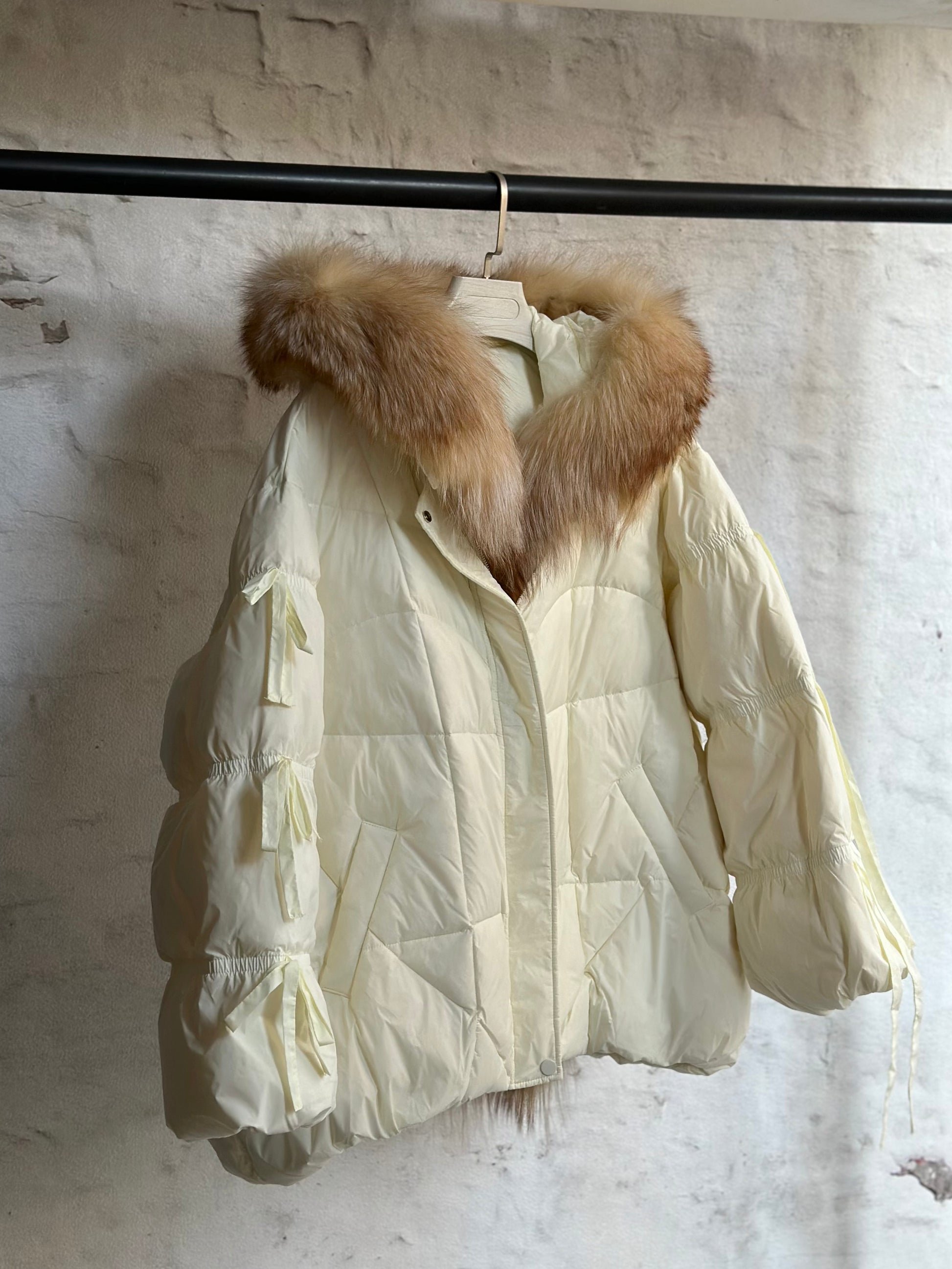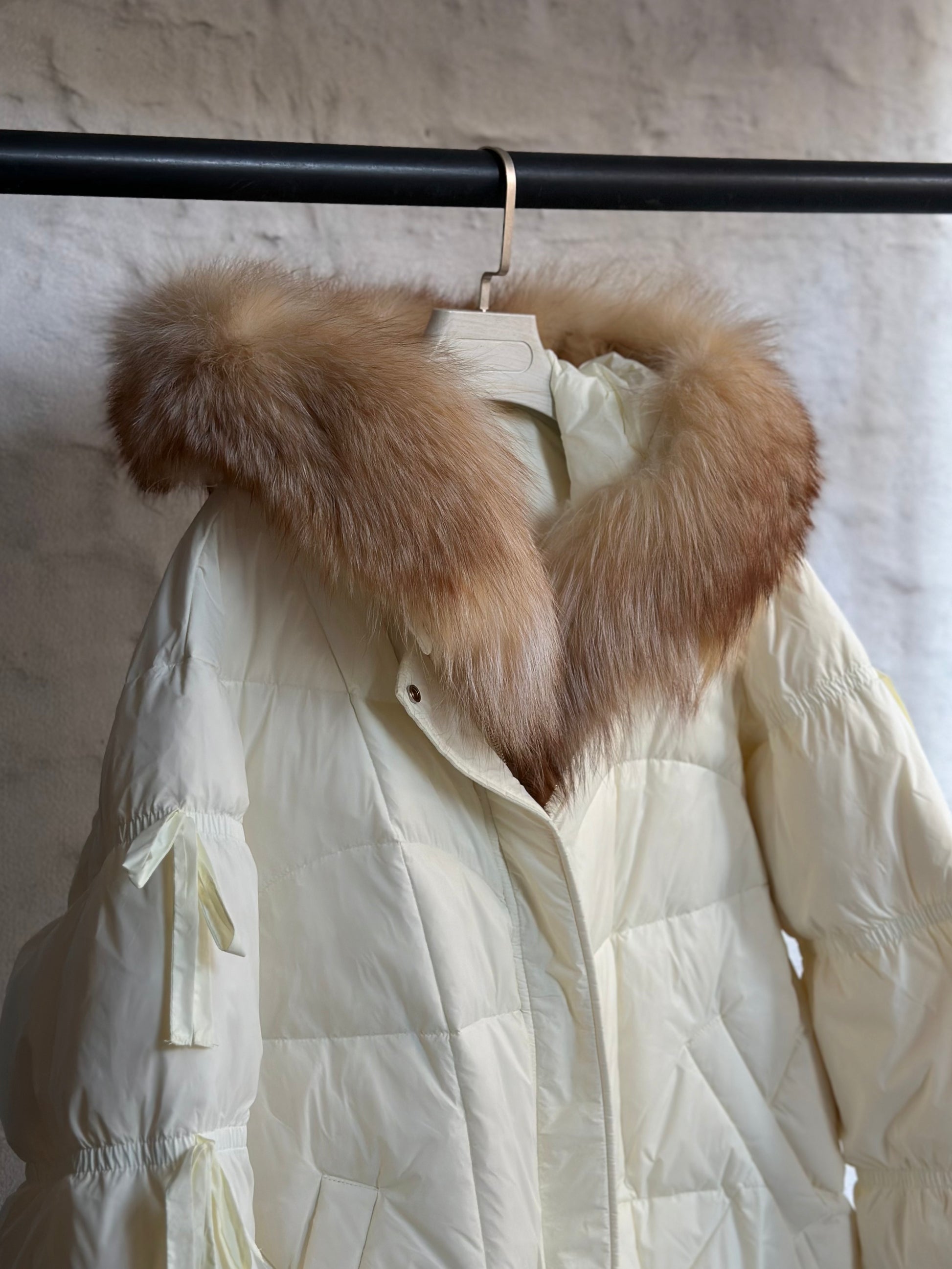 Подготви се за студените дни с това яке в нежен цвят - шампанско. Изработено е от висококачествени материали, то осигурява отлична топлинна изолация, благодарение на пълнежа от гъши пух, който е лек, но невероятно ефективен в запазването на топлината. Якето е с много богат естествен косъм от лисица!