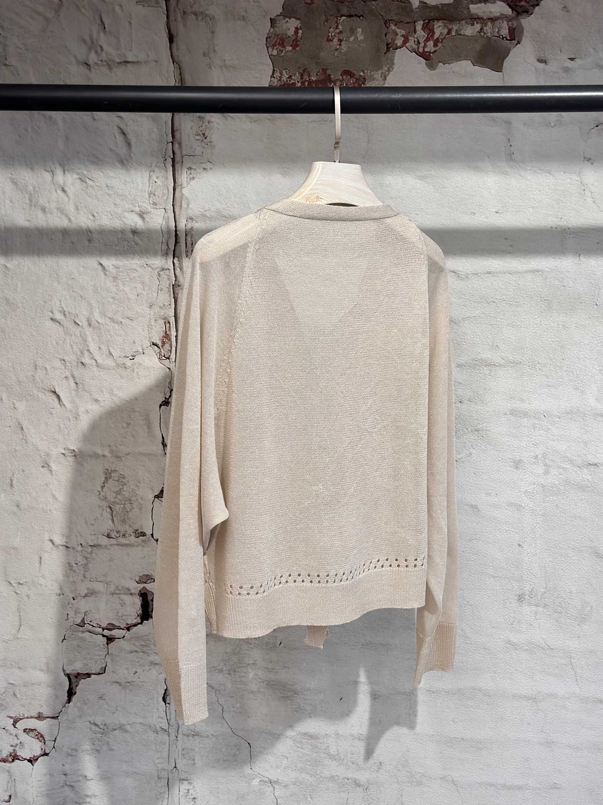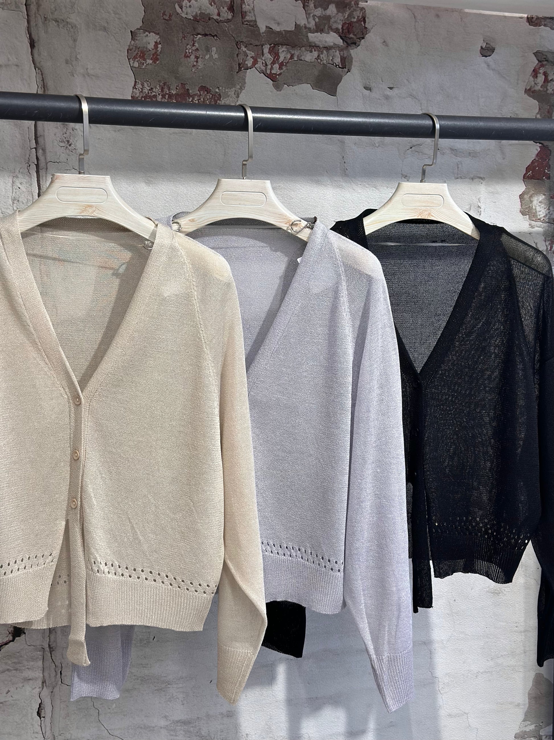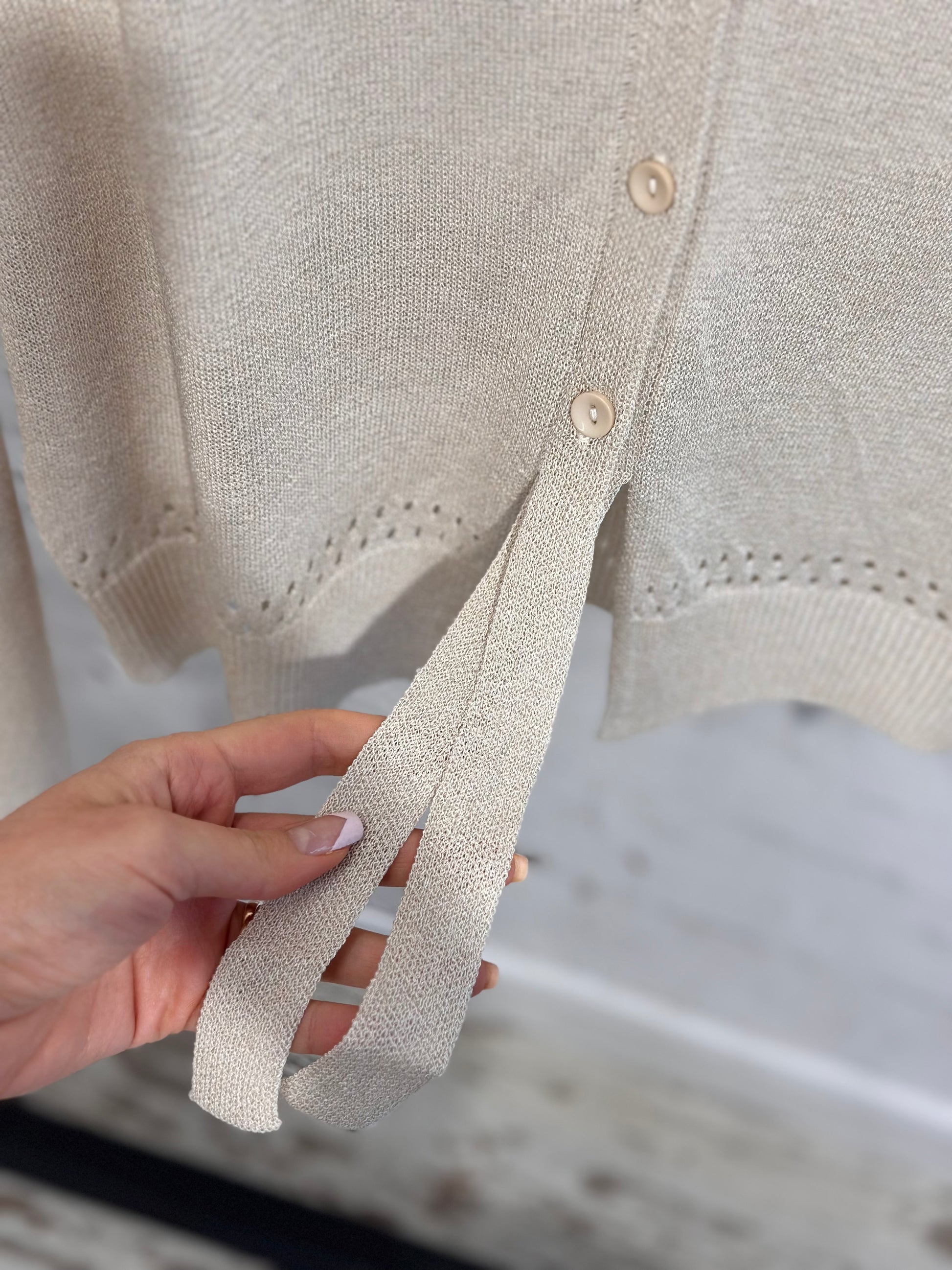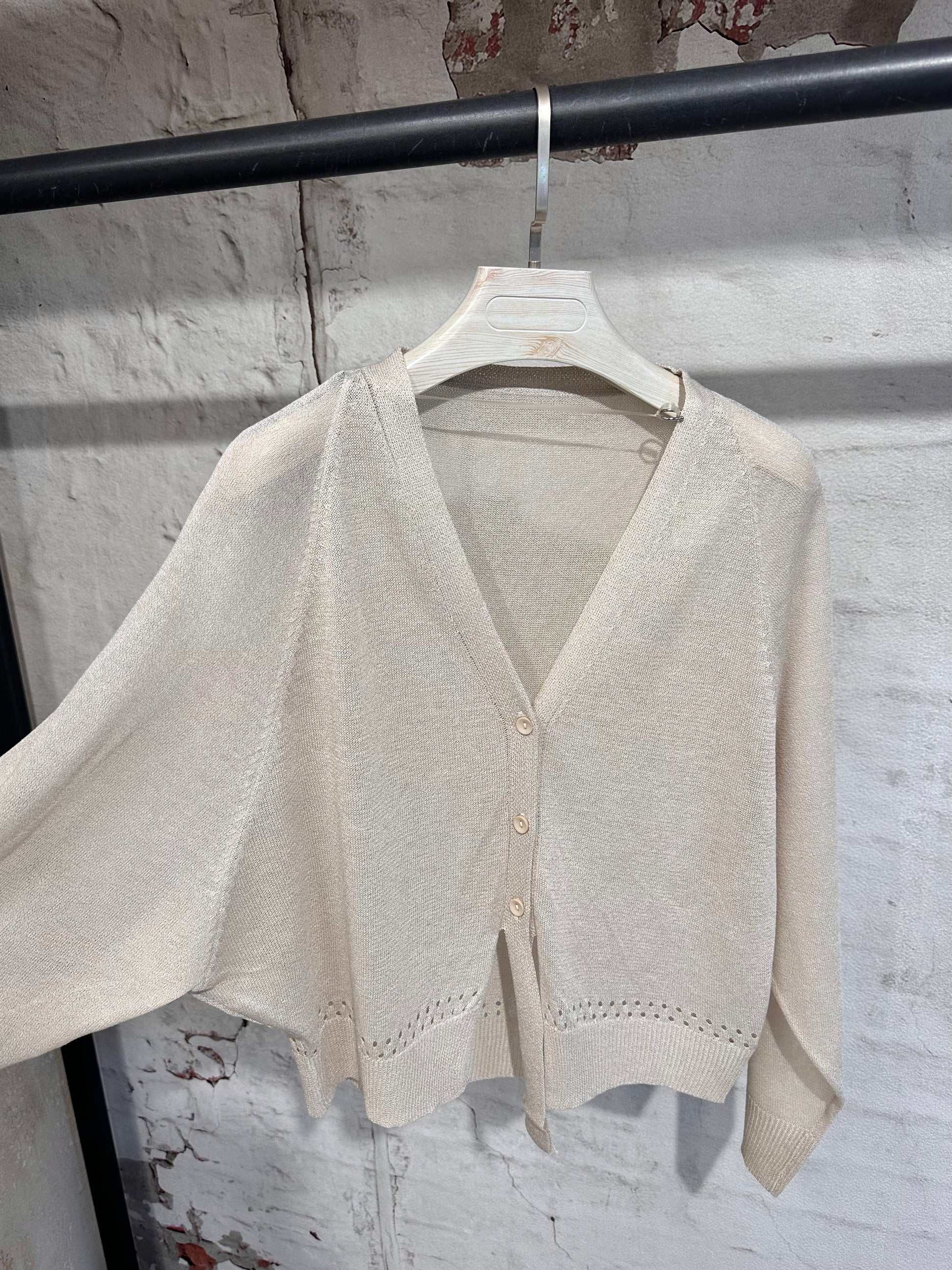 Нежна и ефирна дамска жилетка с копчета,  изработена от изключително фин материал, пада меко по тялото и придава деликатна елегантност.